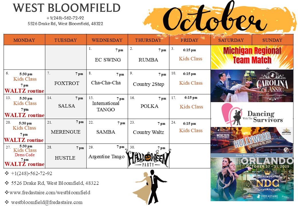Below you will find a monthly calendar of events, group classes, practices parties and more at our new West Bloomfield dance studio!