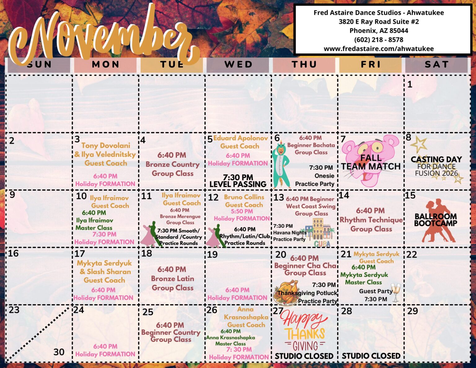 Below you will find our monthly calendar for Fred Astaire Dance Studio of Ahwatukee, including group classes, practice parties, and special events!
