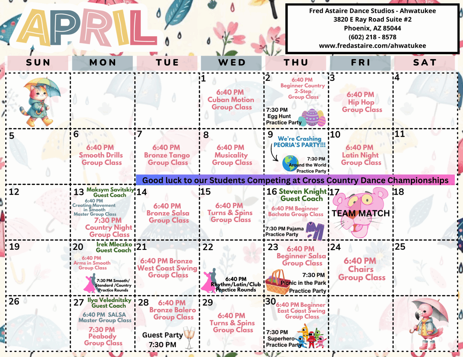 Below you will find our monthly calendar for Fred Astaire Dance Studio of Ahwatukee, including group classes, practice parties, and special events!