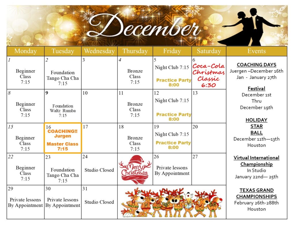 Our group class and party calendar for our current students is shown below. Please ask your instructor for more details on what classes they recommend you attend!