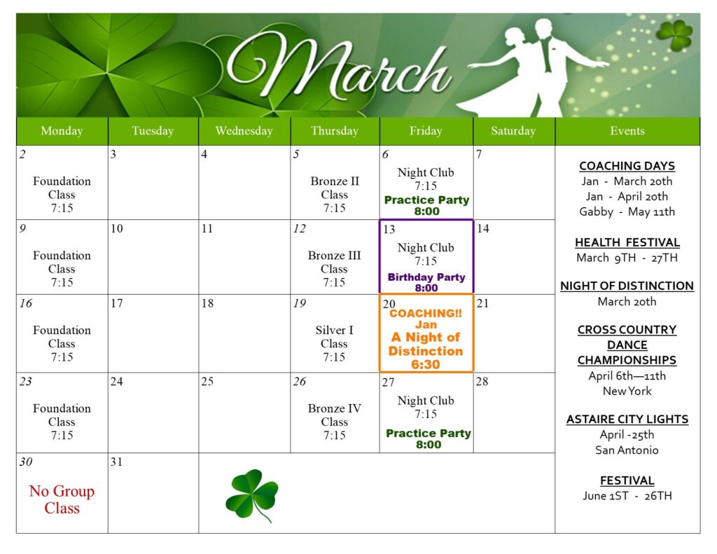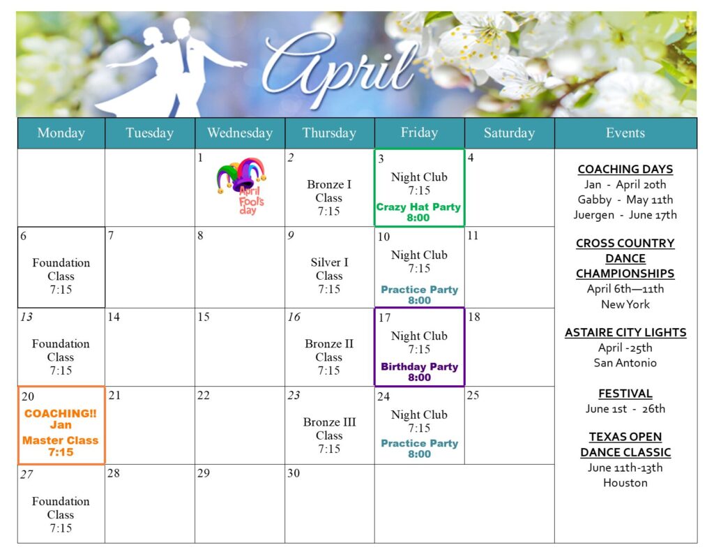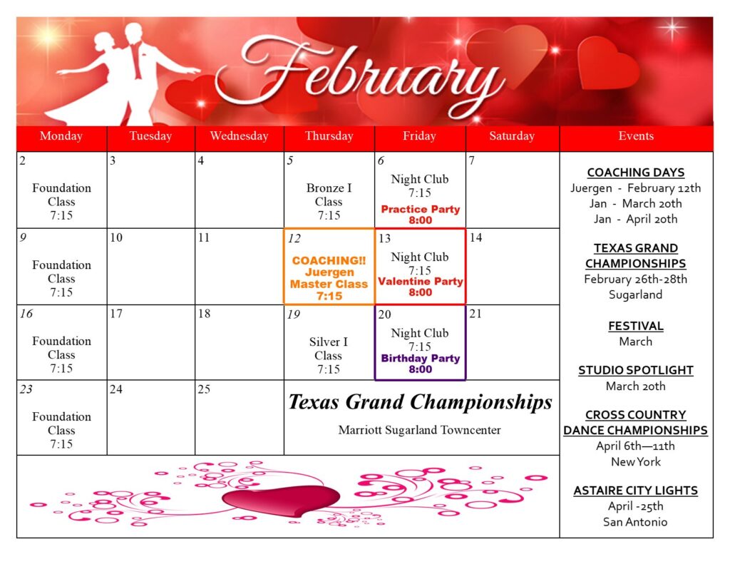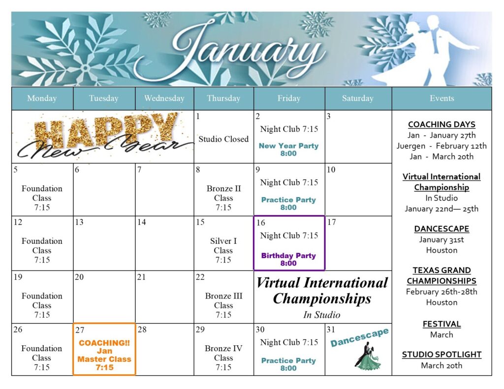 Our group class and party calendar for our current students is shown below. Please ask your instructor for more details on what classes they recommend you attend!