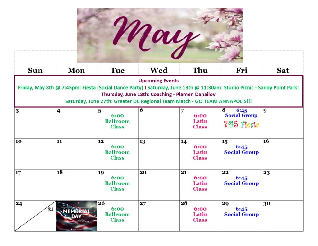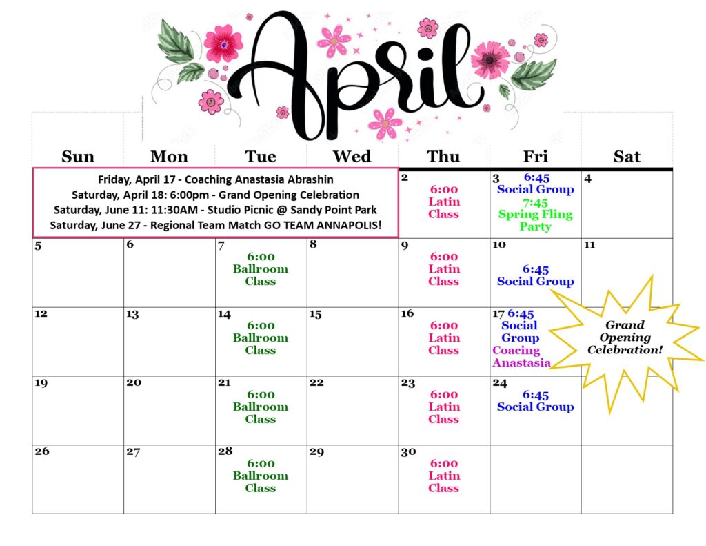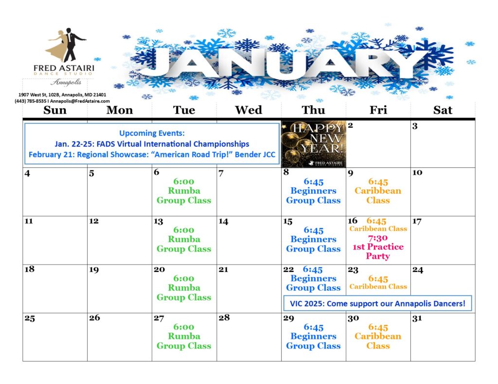 Below you will find our monthly calendar of events for Fred Astaire Dance Studio of Annapolis, including group classes, practice parties, and special events!