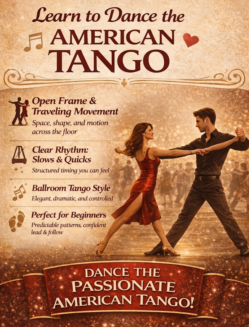 A couple dancing the best dance to learn for beginners - American Tango in a dramatic pose, with the woman in a red dress and the man in black attire. The warm, golden background features musical elements, and text on the left highlights beginner-friendly American Tango features.American Tango: Open Movement, Clear Rhythm