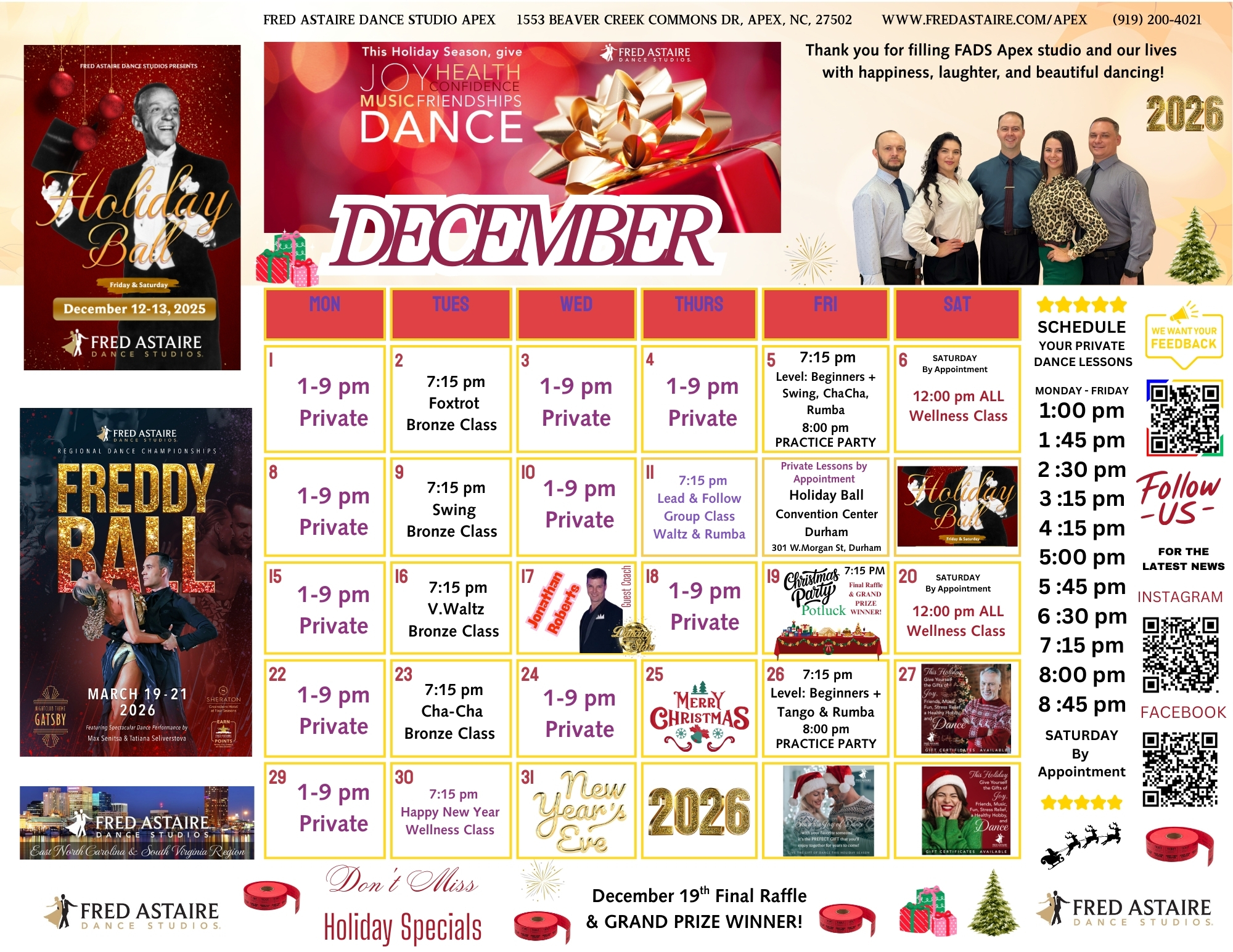 Welcome to the official December 2025 Dance Calendar for Fred Astaire Dance Studio Apex in Apex, North Carolina!