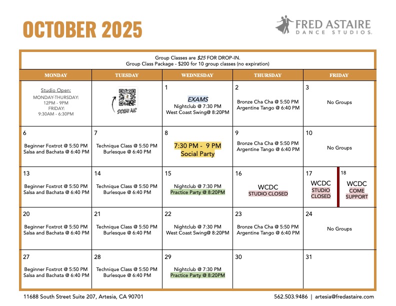 Below you will find our monthly calendar of events for Fred Astaire Dance Studio of Artesia, including group classes, practice parties, and special events!