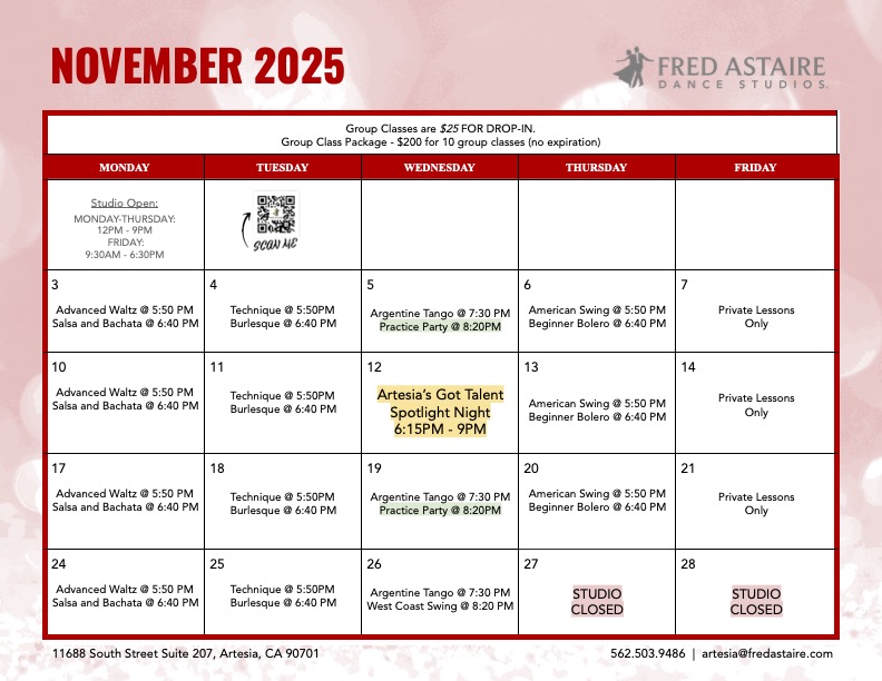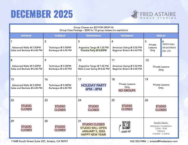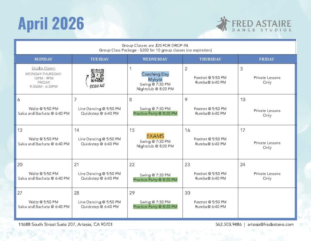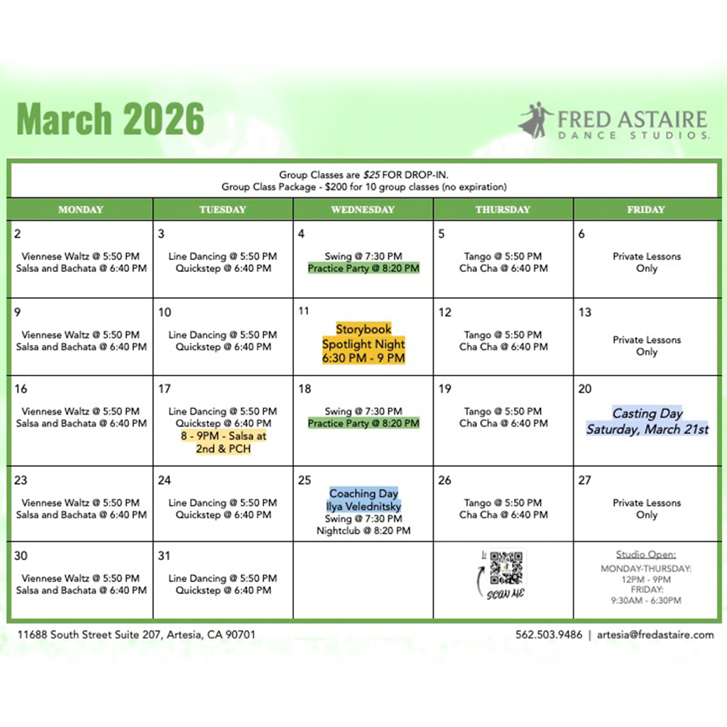 Below you will find our monthly calendar of events for Fred Astaire Dance Studio of Artesia, including group classes, practice parties, and special events!