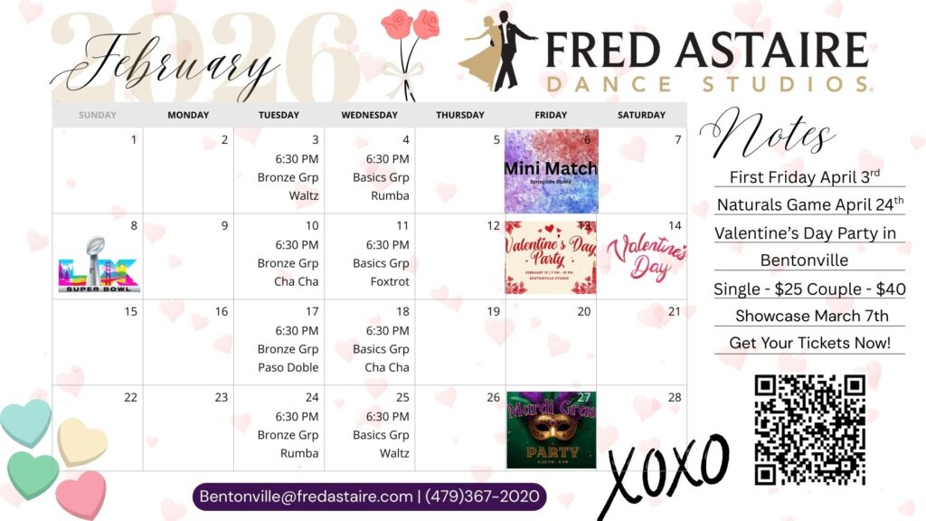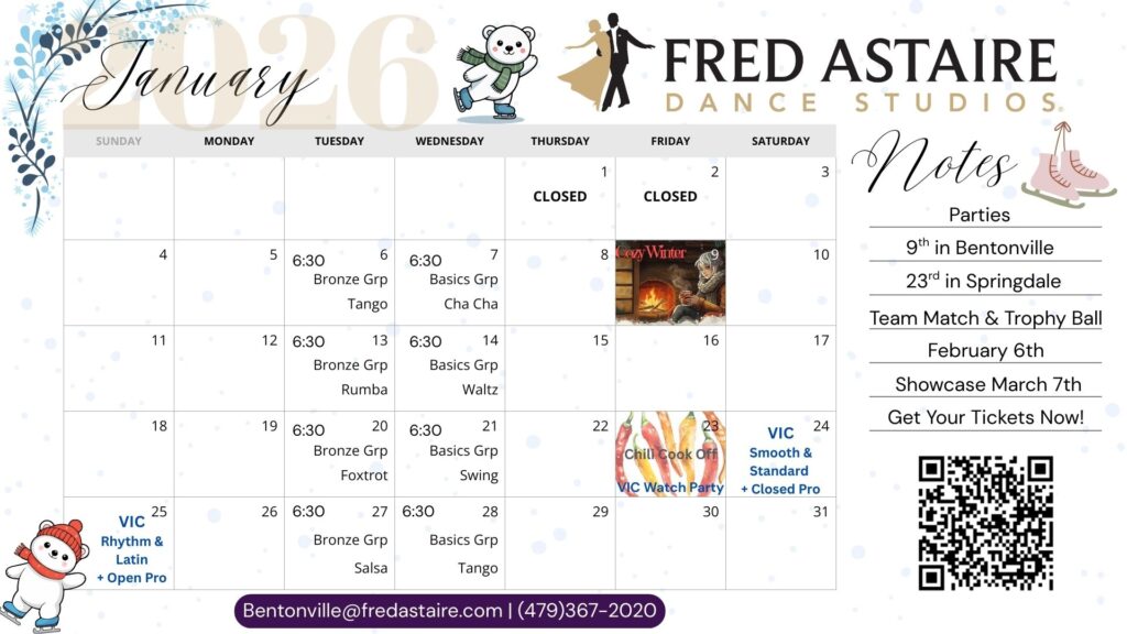 Check out this month’s schedule of Group Classes, Practice Parties and Special Events at our Studio. Come with a dance partner or by yourself. For more information and to join us, just give us a call!