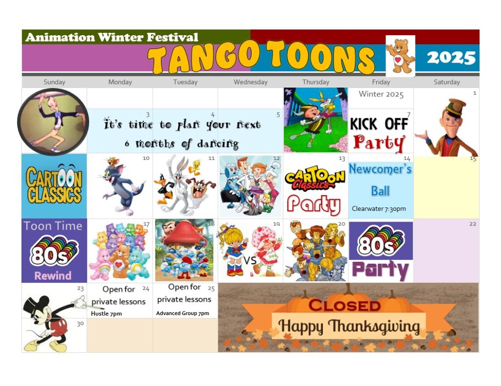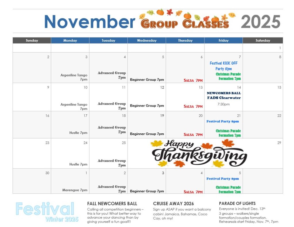 Check out this month’s calendar for the group class and practice party schedule and upcoming events. Please check with your instructor for the appropriate group classes for your program.
