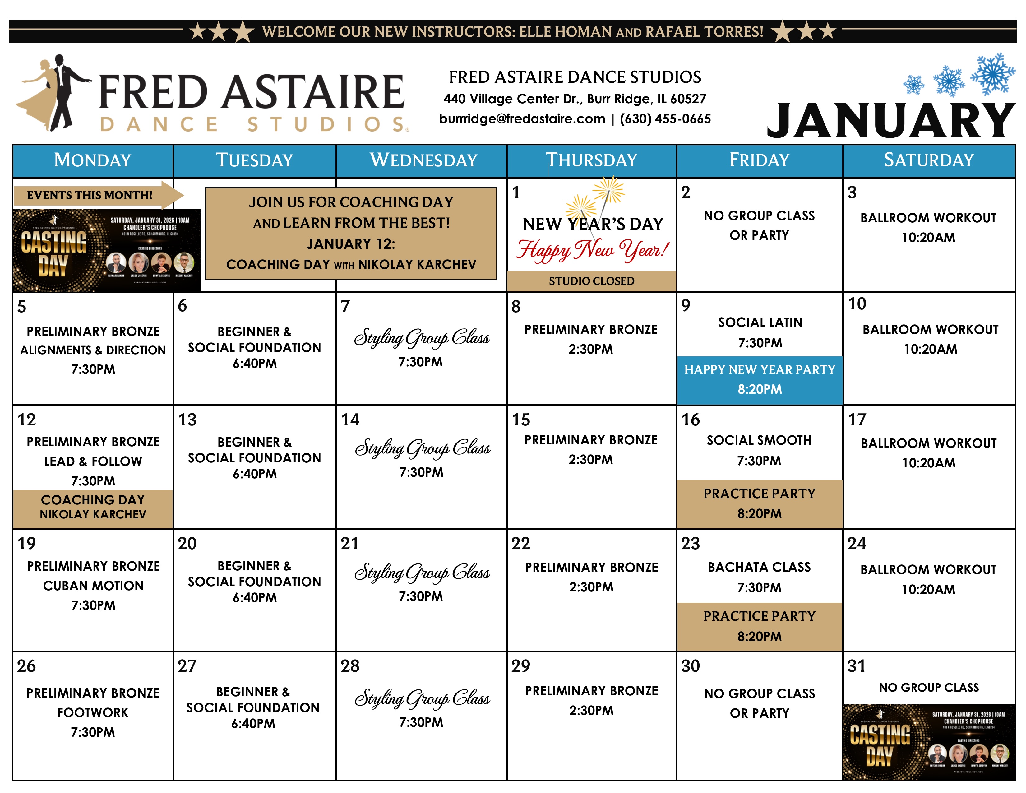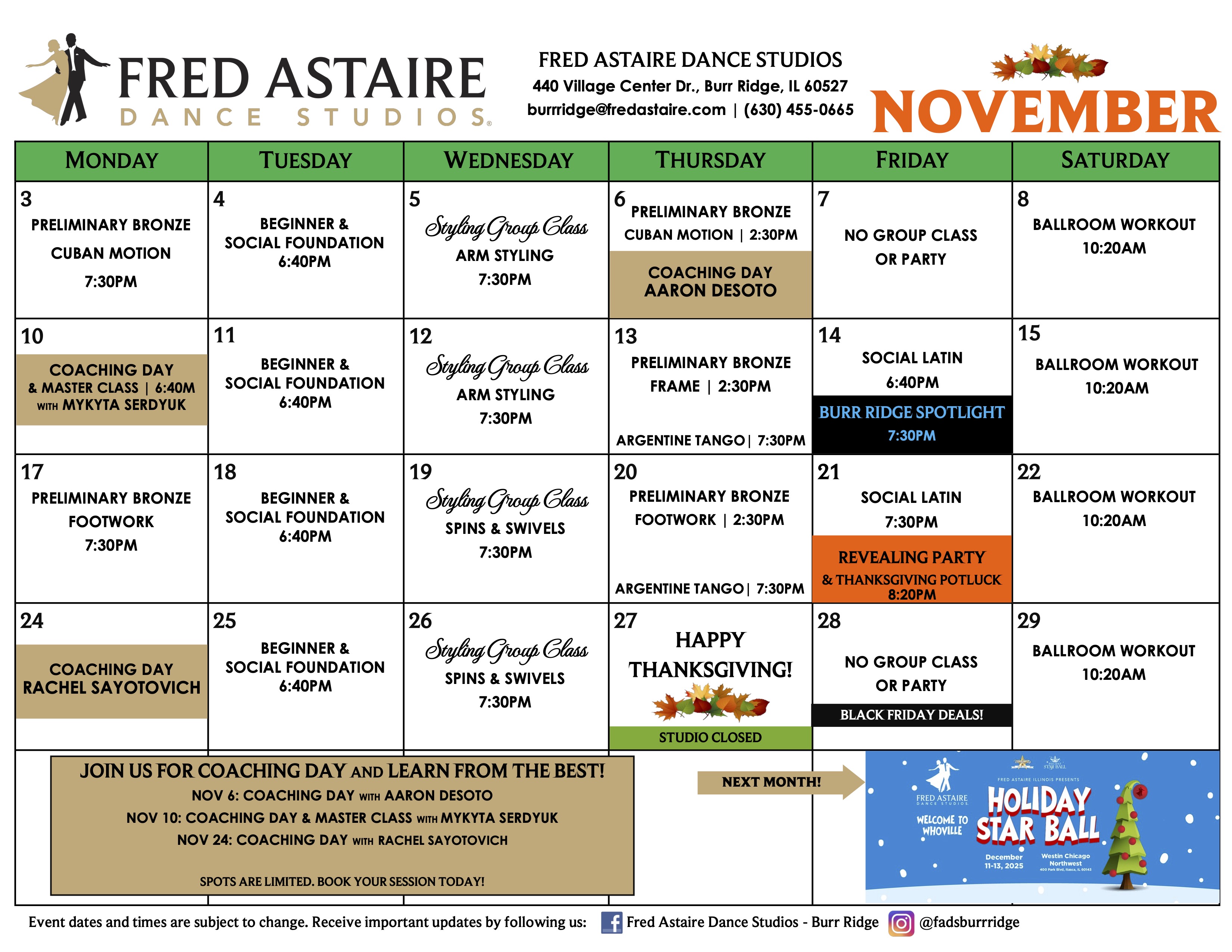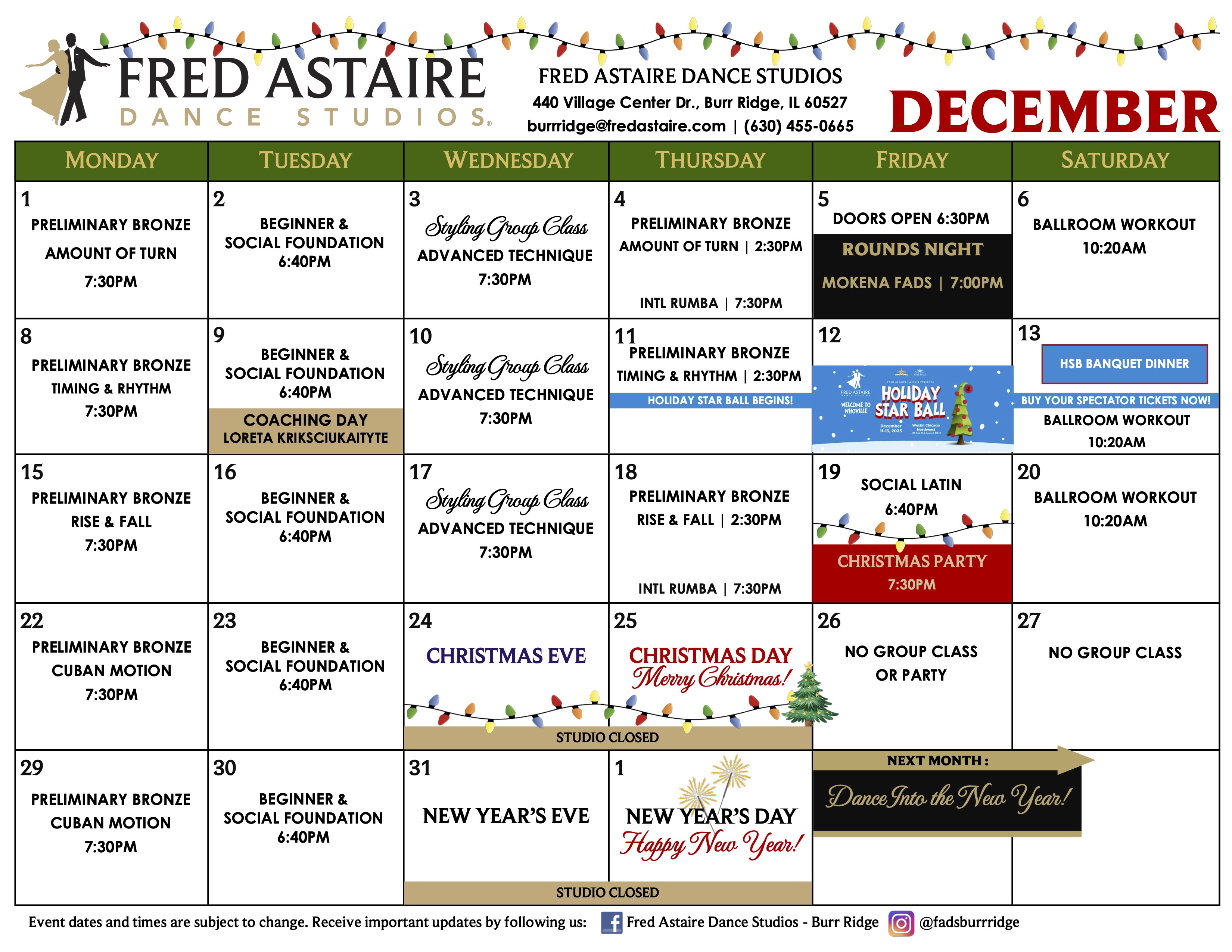Check out this month’s schedule of Group Classes, Practice Parties and Special Events at our Studio. Come with a dance partner or by yourself. For more information and to join us, just give us a call! 630-455-0665