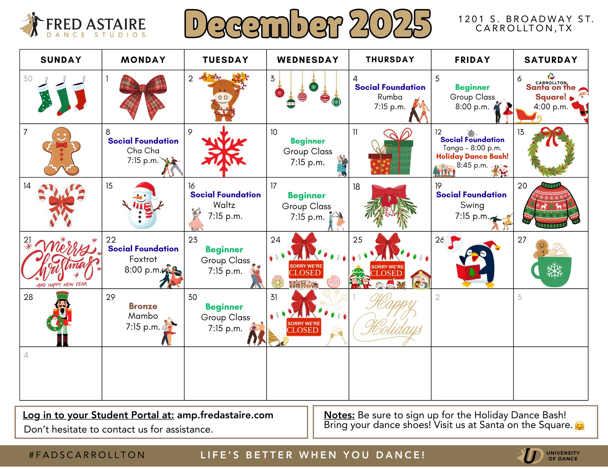 Below you will find our monthly calendar of events for Fred Astaire Dance Studio of Carrollton, including group classes, practice parties, and special events!