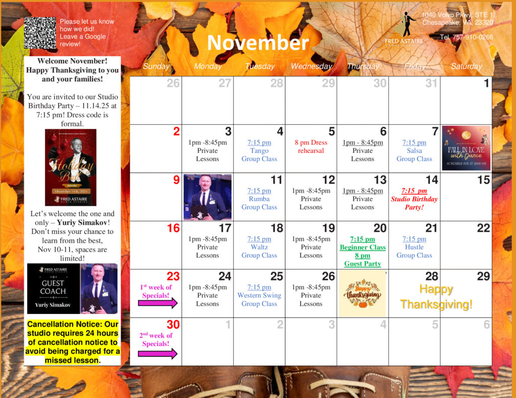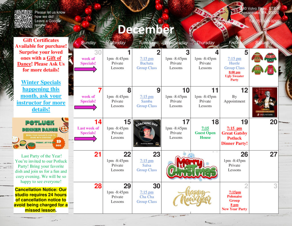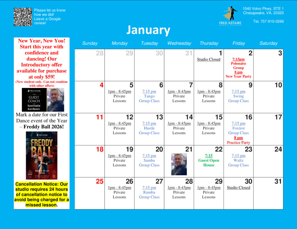 Take a look at this month’s exciting schedule for Group Classes, Practice Parties, and Special Events at our Studio! Whether you bring a dance partner or come on your own, we’ve got something for everyone. Reach out for more info or to sign up!