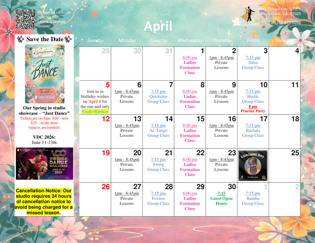 Take a look at this month’s exciting schedule for Group Classes, Practice Parties, and Special Events at our Studio! Whether you bring a dance partner or come on your own, we’ve got something for everyone. Reach out for more info or to sign up!