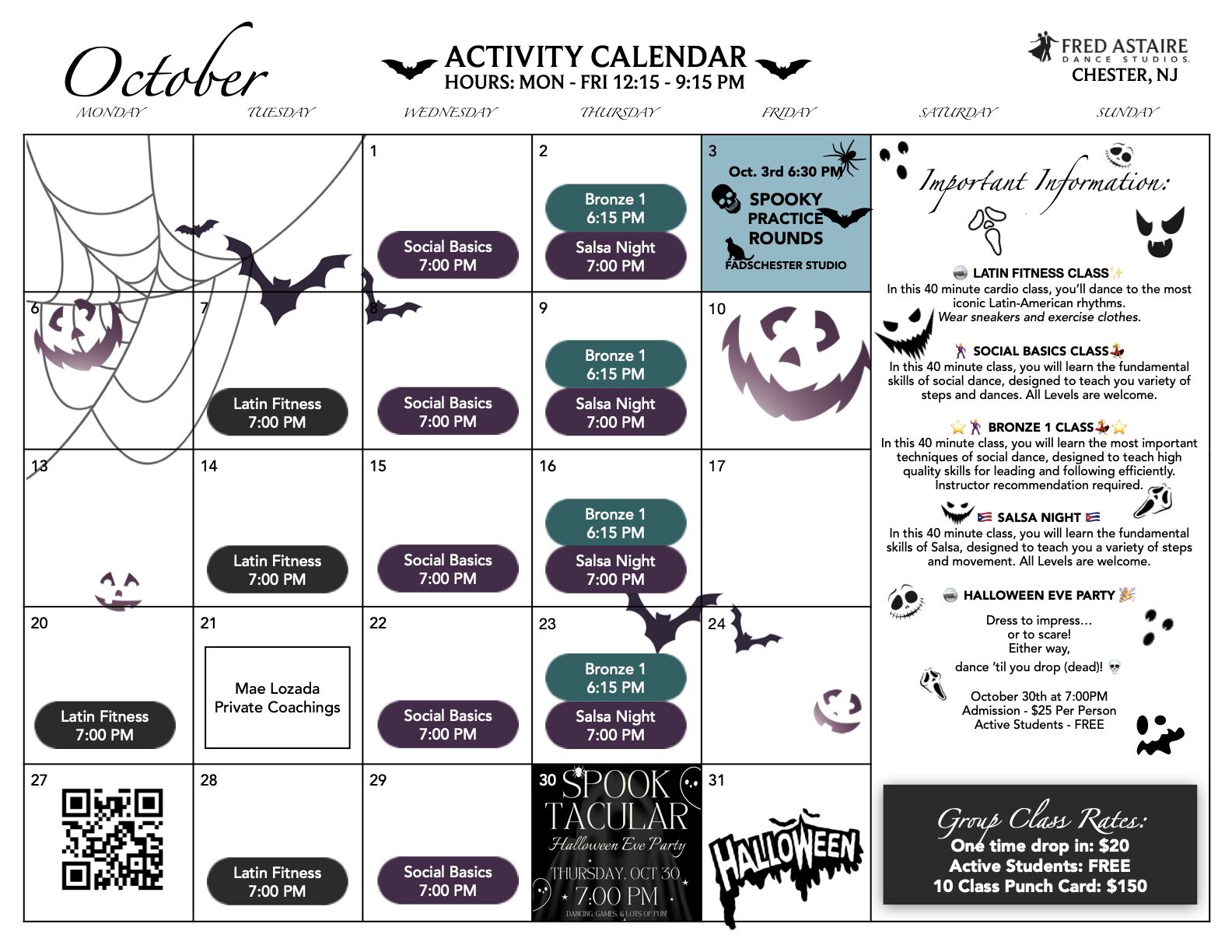 Below you will find our monthly calendar of events for Fred Astaire Dance Studio of Chester, including group classes, practice parties, and special events!