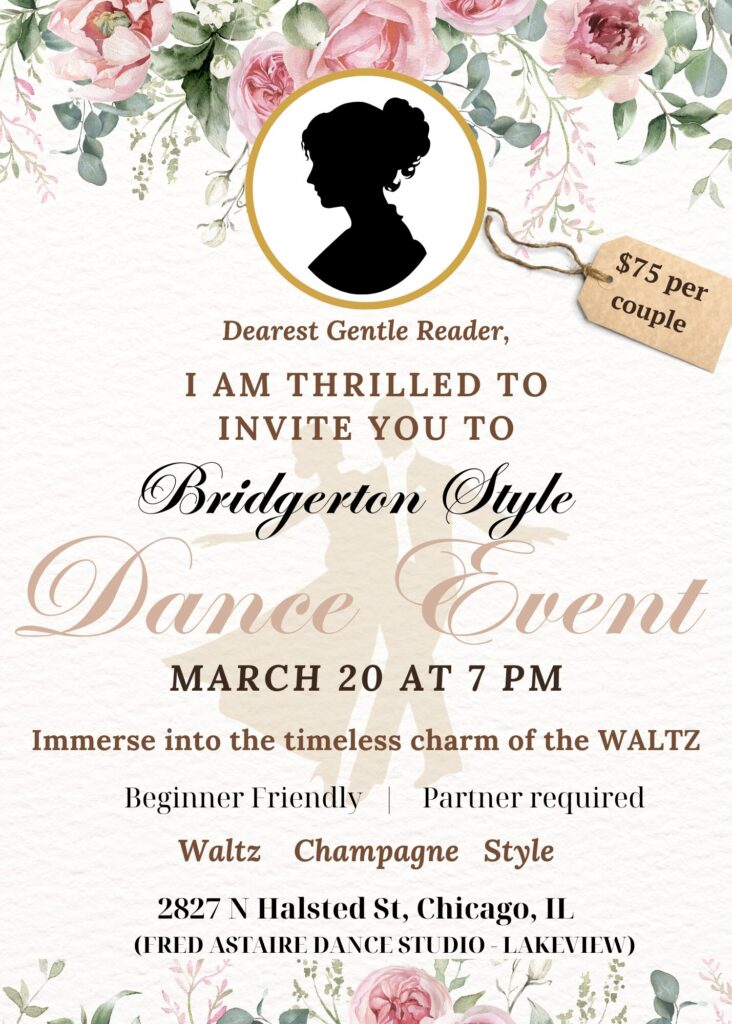 🕺A Bridgerton Style Dance Event, promising waltzes, whispers, and wonder, shall take place on the twenties of March at the stroke of 7 in the evening.