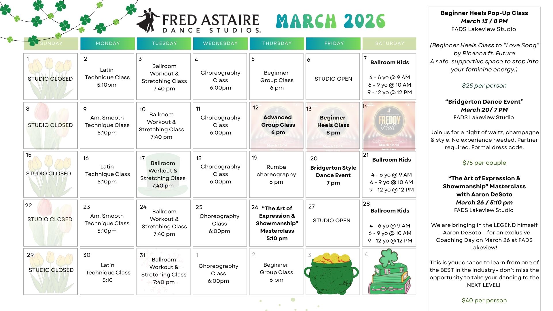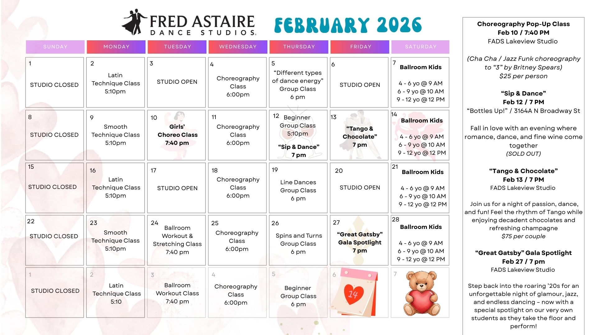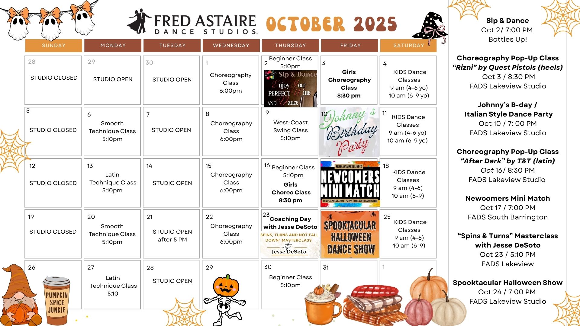Below you will find our monthly calendar of events for Fred Astaire Dance Studio of Lakeview, including group classes, practice parties, and special events! Call 773-882-0099