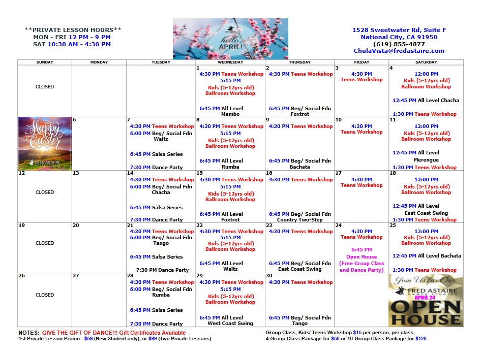Below you will find our monthly calendar of events for Fred Astaire Dance Studio of (Chula Vista/ National City), including group classes, practice parties, and special events!