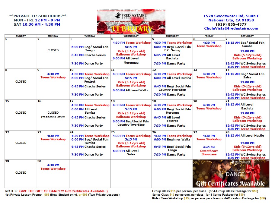 Below you will find our monthly calendar of events for Fred Astaire Dance Studio of (Chula Vista/ National City), including group classes, practice parties, and special events!