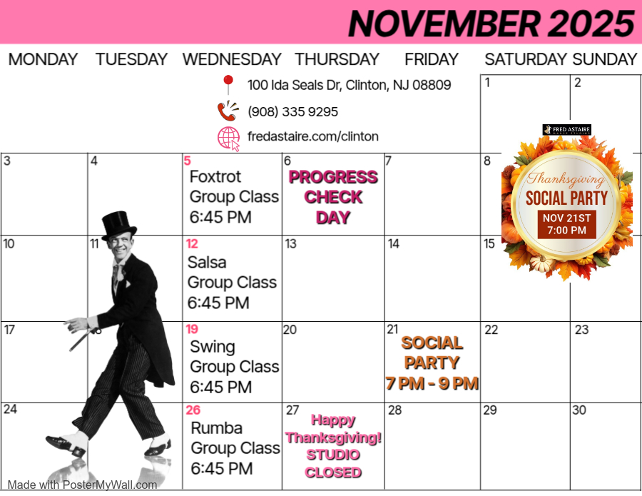 Below is our monthly calendar of events at Fred Astaire Dance Studio of Clinton, NJ — including group classes, practice parties, and exciting special events you won’t want to miss!