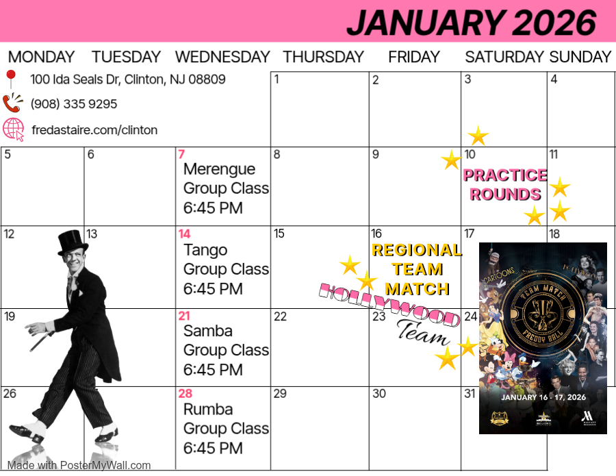 Below is our monthly calendar of events at Fred Astaire Dance Studio of Clinton, NJ — including group classes, practice parties, and exciting special events you won’t want to miss!