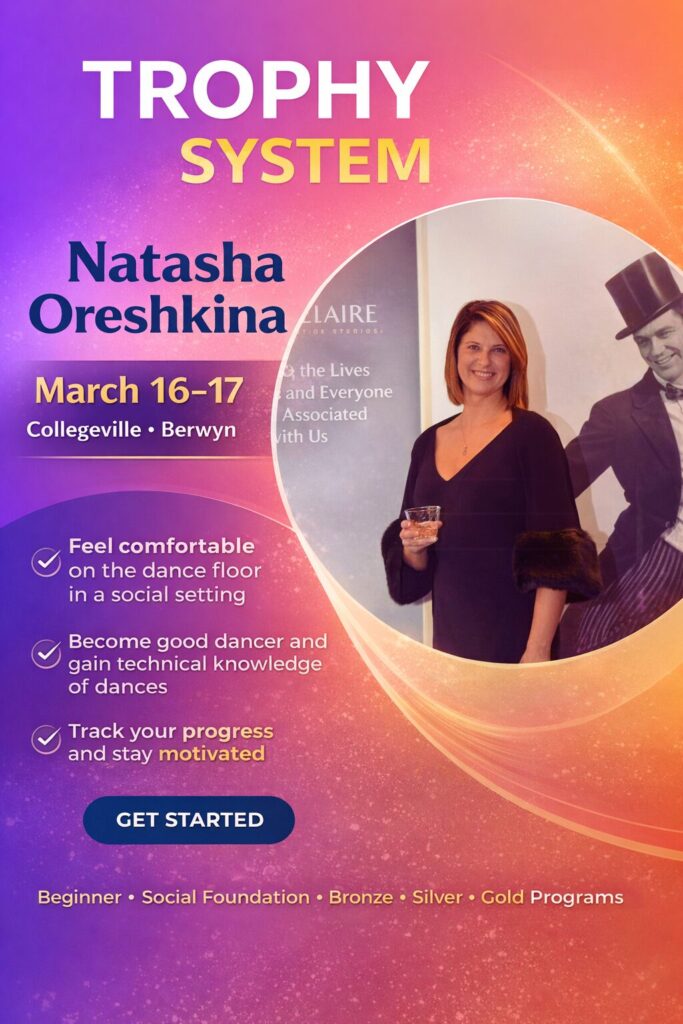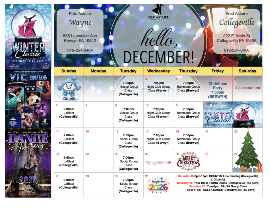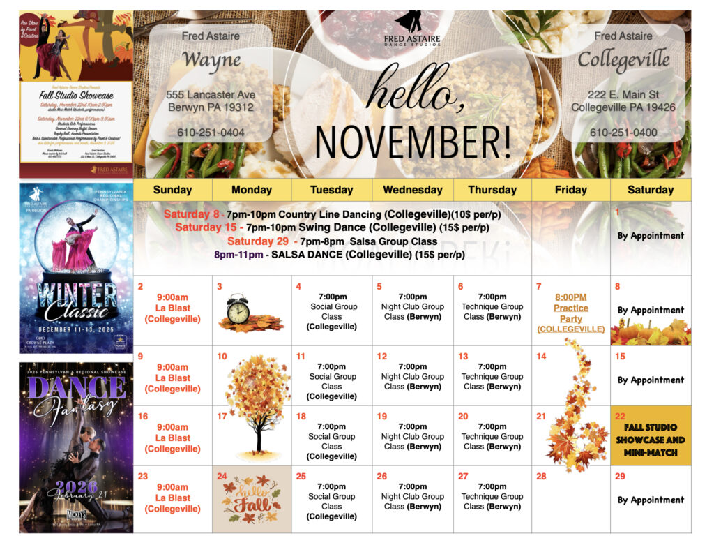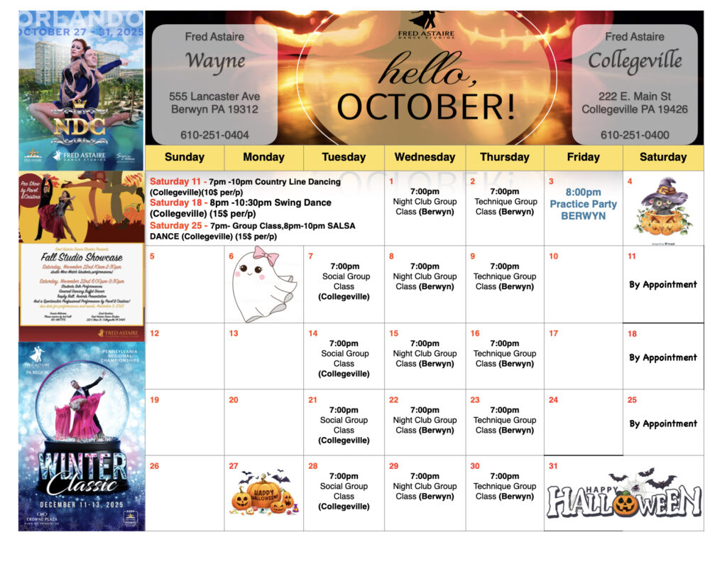 Check out this month’s schedule of Group Classes, Practice Parties and Special Events at our Studio. Come with a dance partner or by yourself. For more information and to join us, just give us a call!