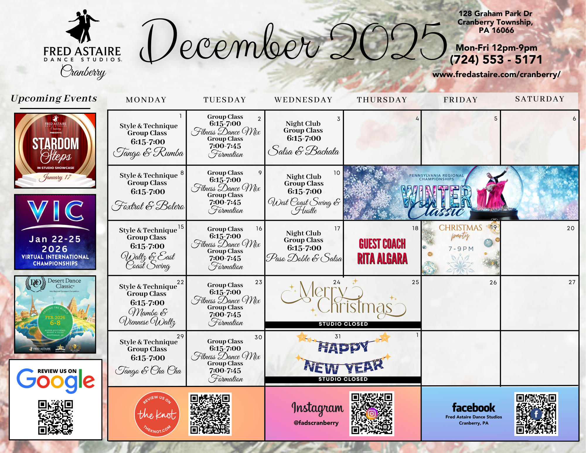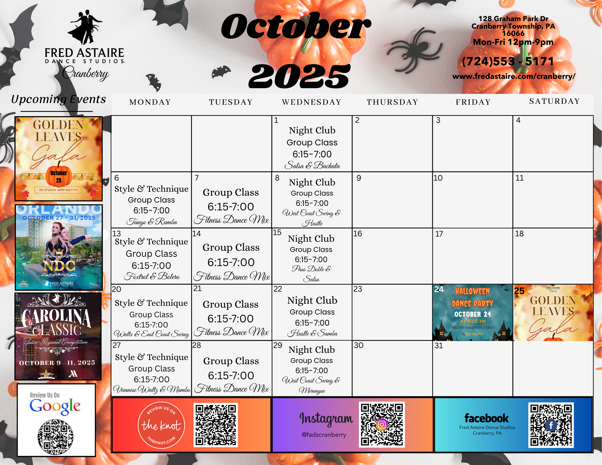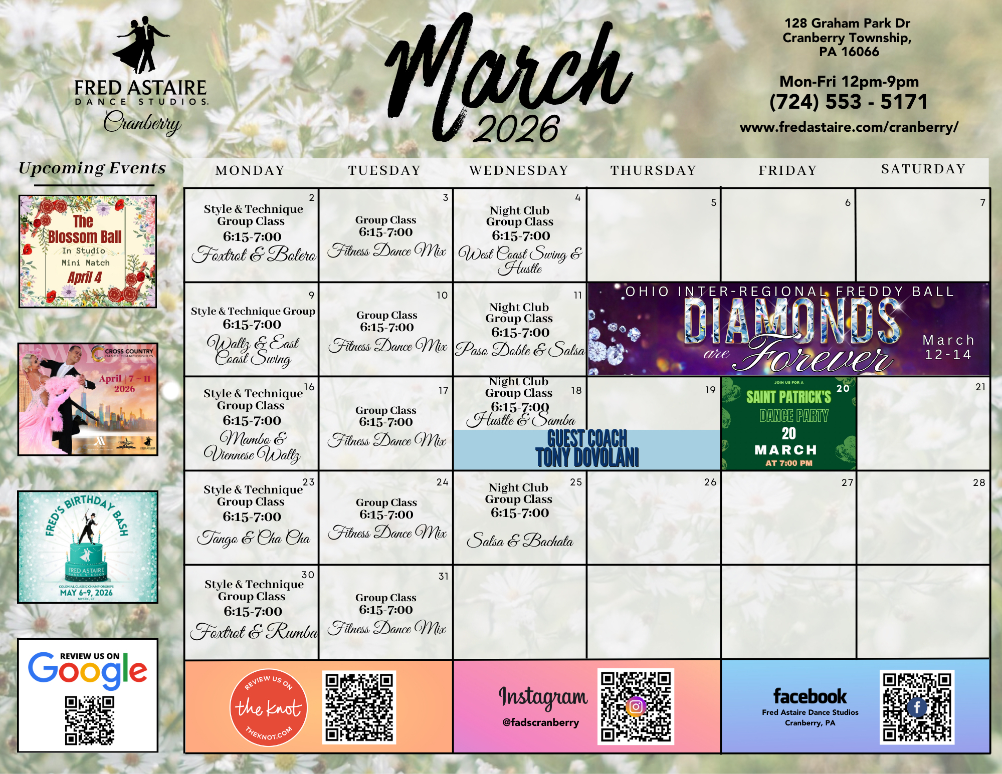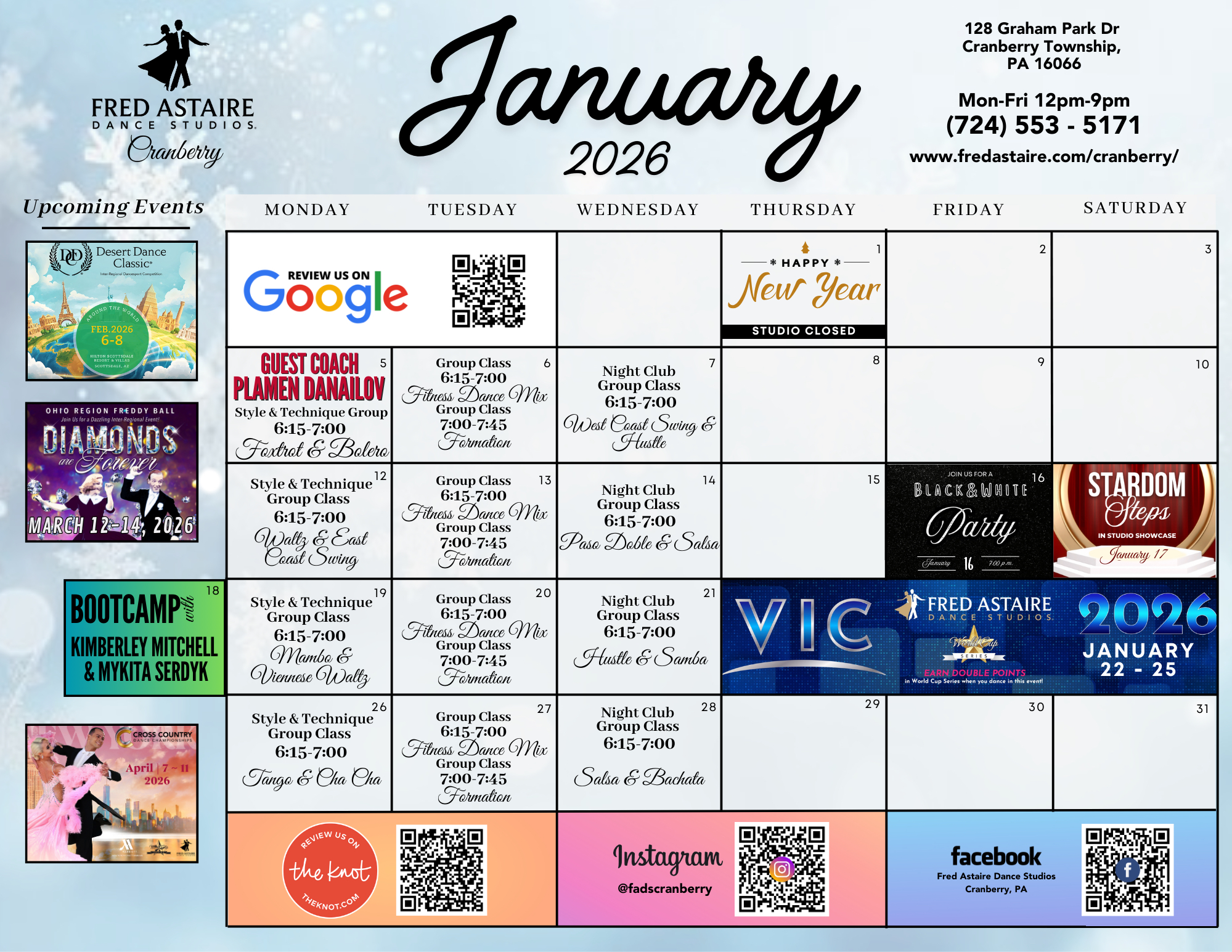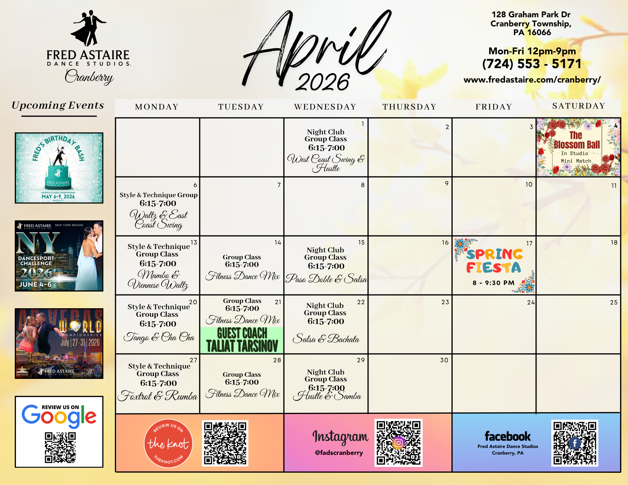 Check out this month’s schedule of Group Classes, Practice Parties, and Special Events at our Studio. Come with a dance partner or by yourself.