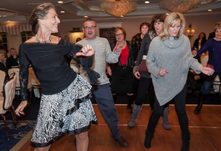 Professional dancer and instructor Raleen St. Pierre of the Fred Astaire Studio teaches a line dance during the Old Saybrook Rotary Club’s 20th annual Wine & Beer Tasting and Silent Auction held on Feb. 10 at the Old Saybrook Point Inn.