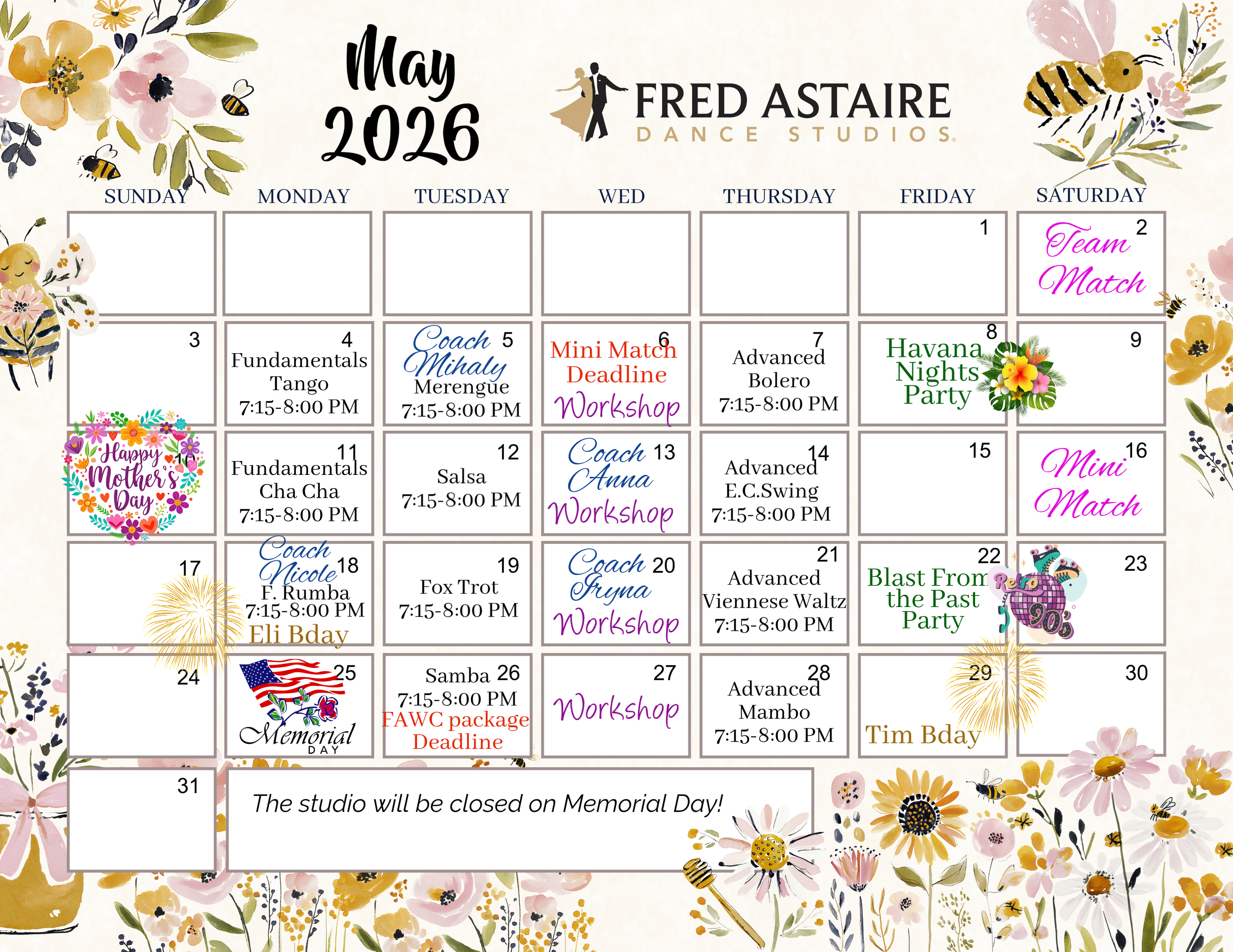 Don’t miss out on any of our events! Bookmark this page and check back regularly for updates on class schedules, special events, and any last-minute changes. You can also follow us on social media to get the latest news and join our vibrant dance community.