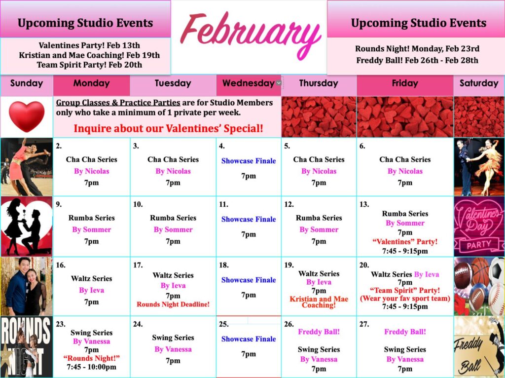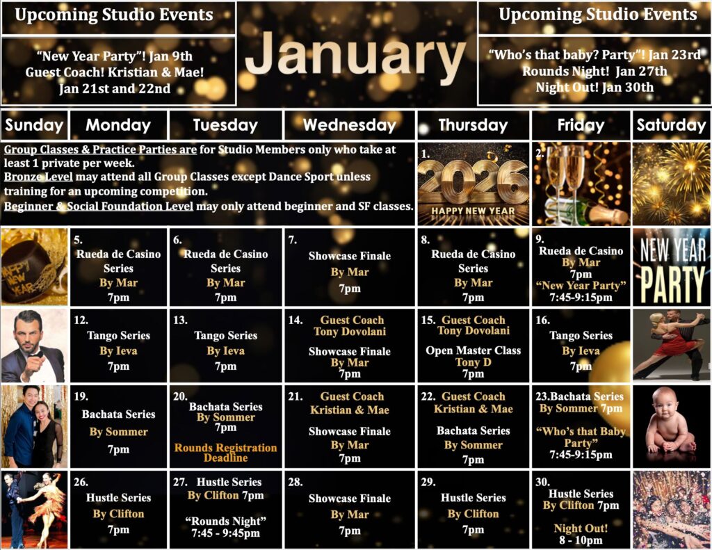 Check out this month’s schedule of Group Classes, Practice Parties and Special Events at our Studio. Come with a dance partner or by yourself. For more information and to join us, just give us a call!