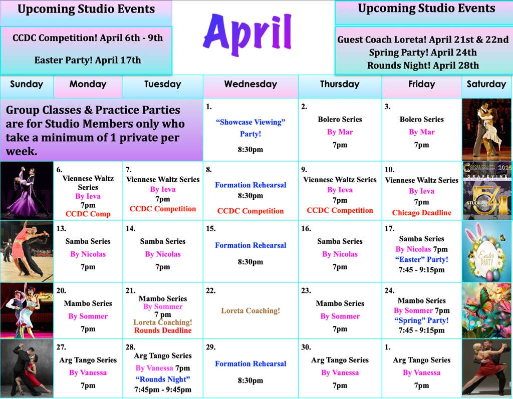 Check out this month’s schedule of Group Classes, Practice Parties and Special Events at our Studio. Come with a dance partner or by yourself. For more information and to join us, just give us a call!
