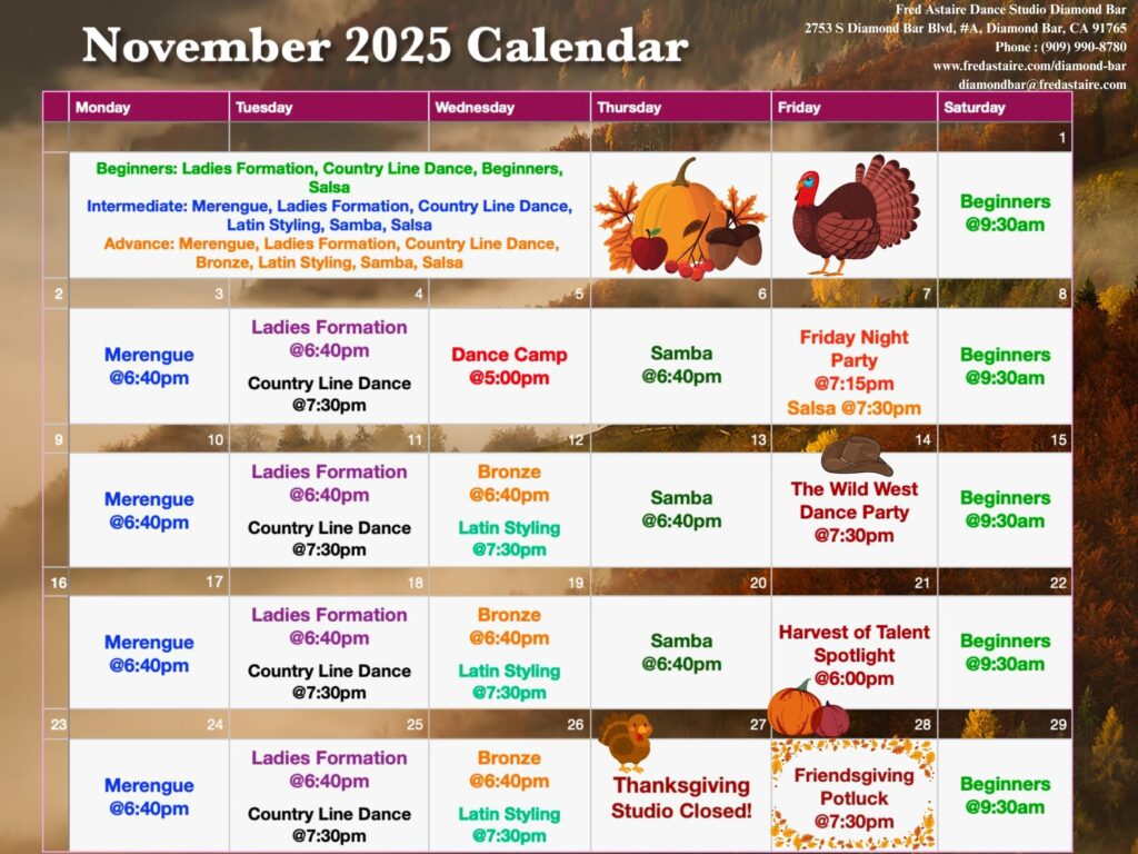 Check out this month’s schedule of Group Classes, Practice Parties and Special Events at our Studio. Come with a dance partner or by yourself. For more information and to join us, just give us a call!