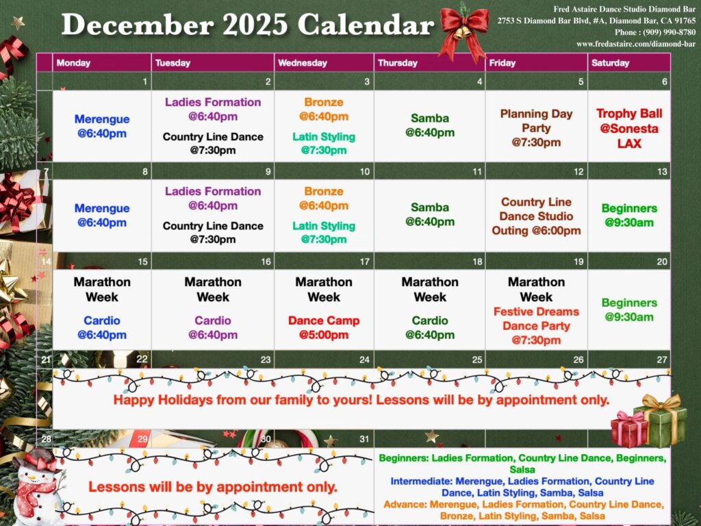 Check out this month’s schedule of Group Classes, Practice Parties and Special Events that are in our studio. Come with a dance partner or by yourself. No experiences needed! For more information and to join us, just give us a call!