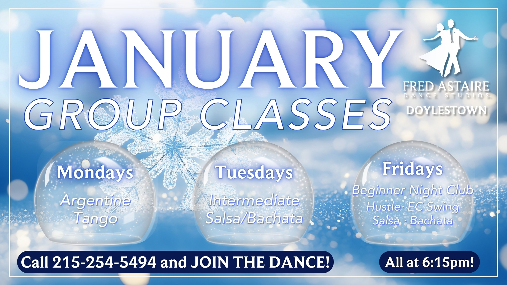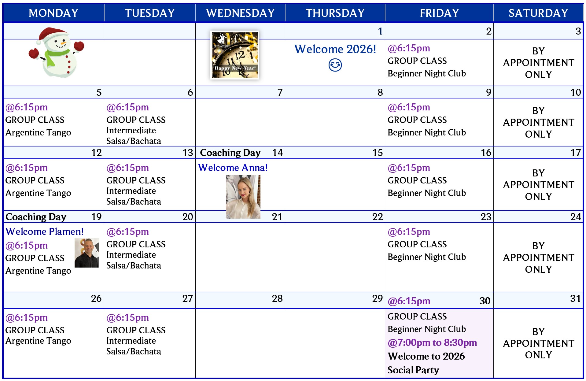 Check out this month’s schedule of Group Classes, Social Parties and Special Events at our Studio. Come with a dance partner or by yourself. For more information and to join us, just give us a call!