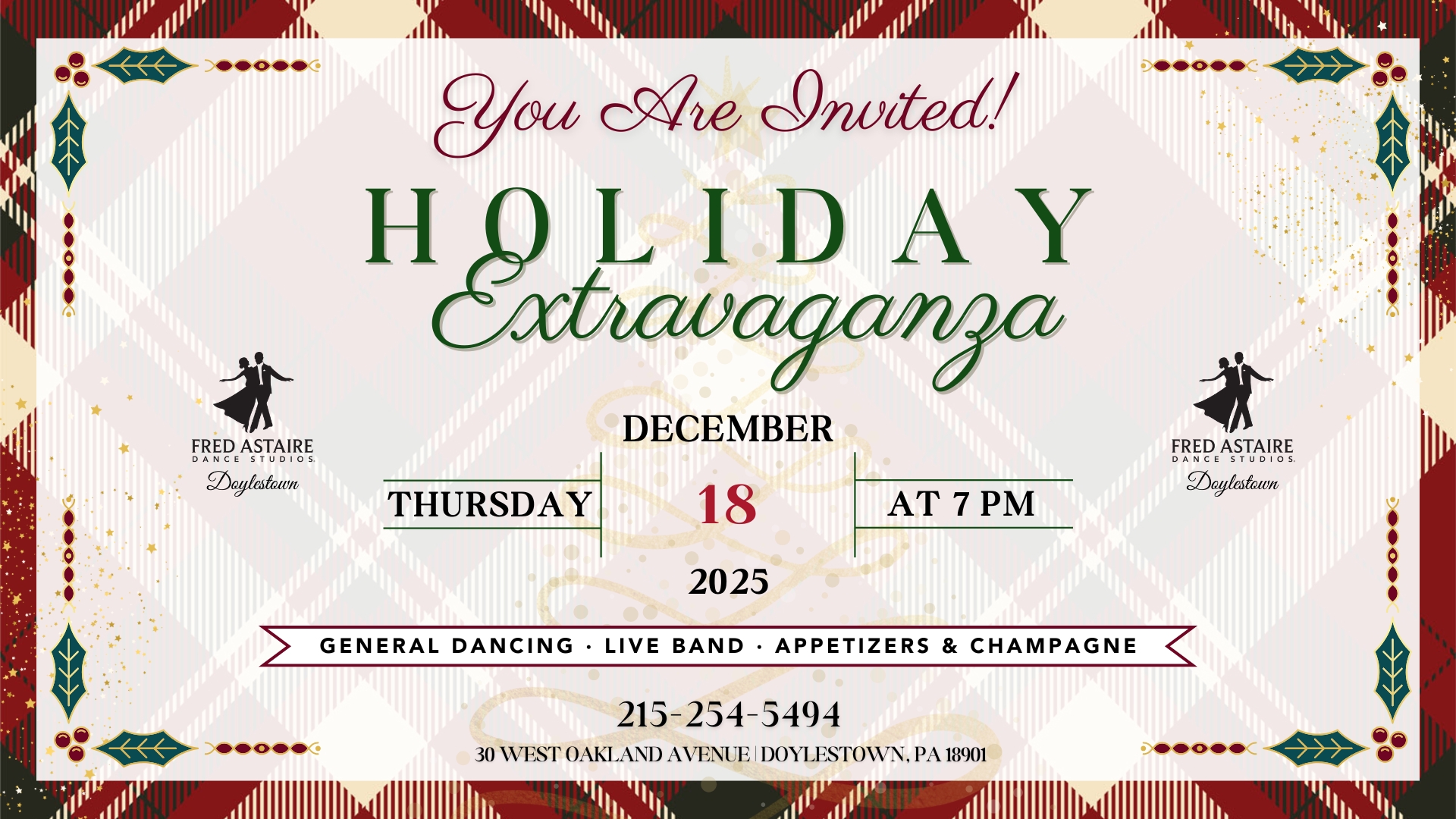 On Thursday, December 18th at 7pm, attend our Holiday Extravaganza featuring live band music, appetizers and champagne, and special Student / Pro performances.