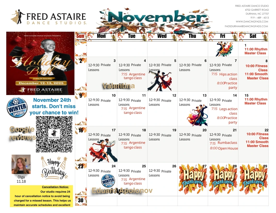 Check out this month’s schedule of Group Classes, Practice Parties and Special Events at our Durham Dance Studio. Come with a dance partner or by yourself—all dancers are matched with another solo dancer or with a instructor, ensuring thorough instructions and clear direction. For more information or to join us, just give us a call at 919-489-4313 today.