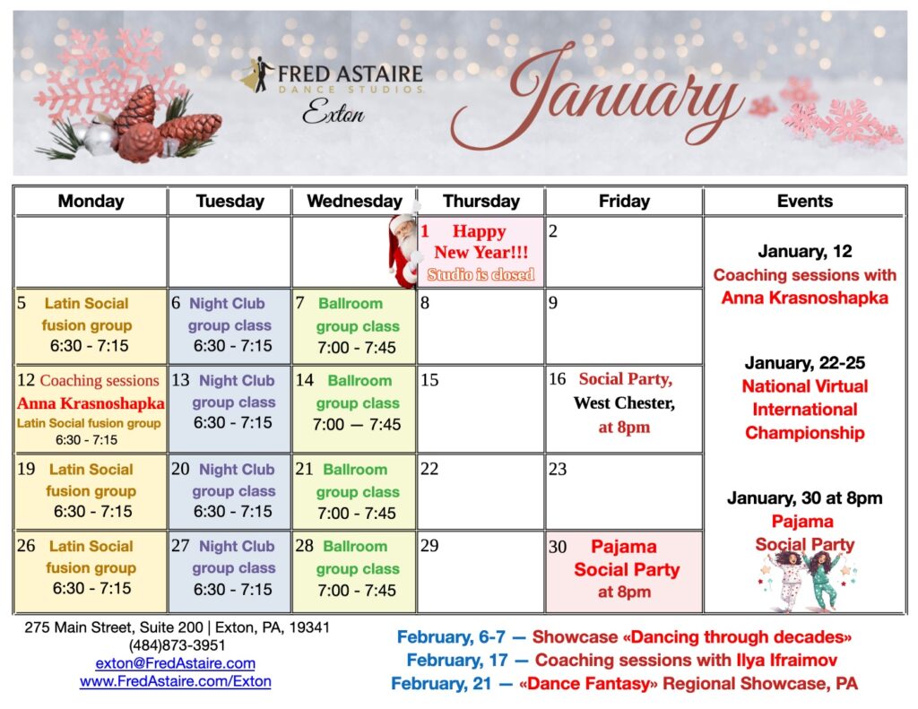 Below you will find our monthly calendar of events for Fred Astaire Dance Studio of Exton, including group classes, practice parties, and special events!