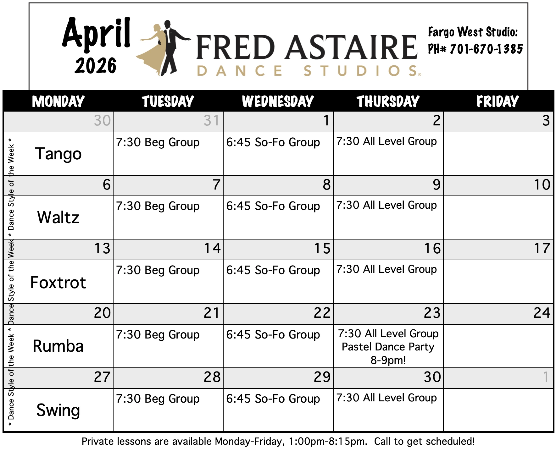 Below you will find our monthly calendar of events for Fred Astaire Dance Studio of Fargo West, including group classes, practice parties, and special events!