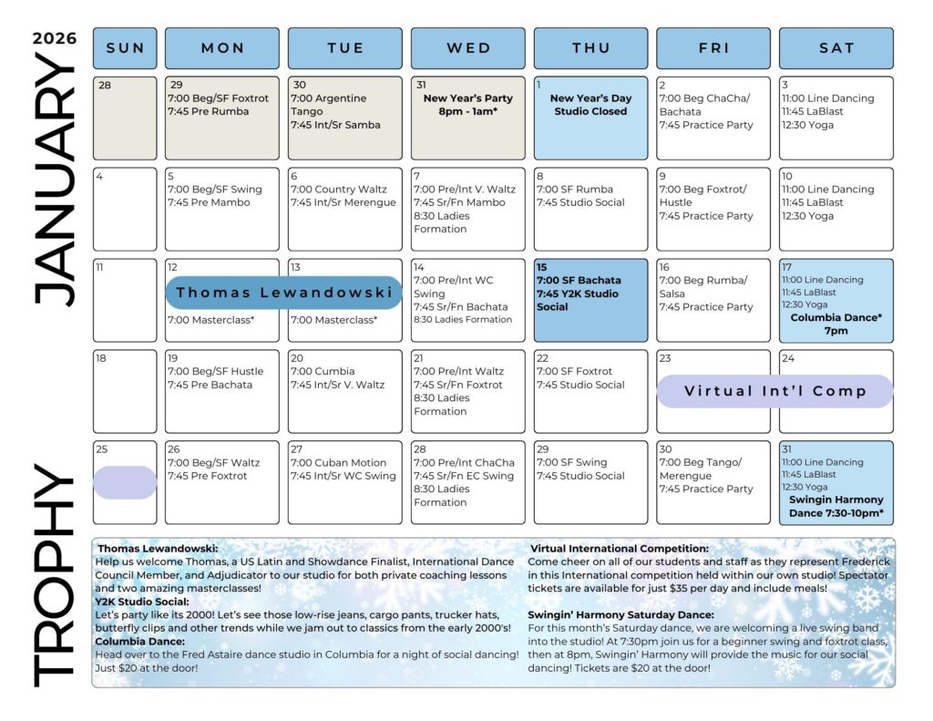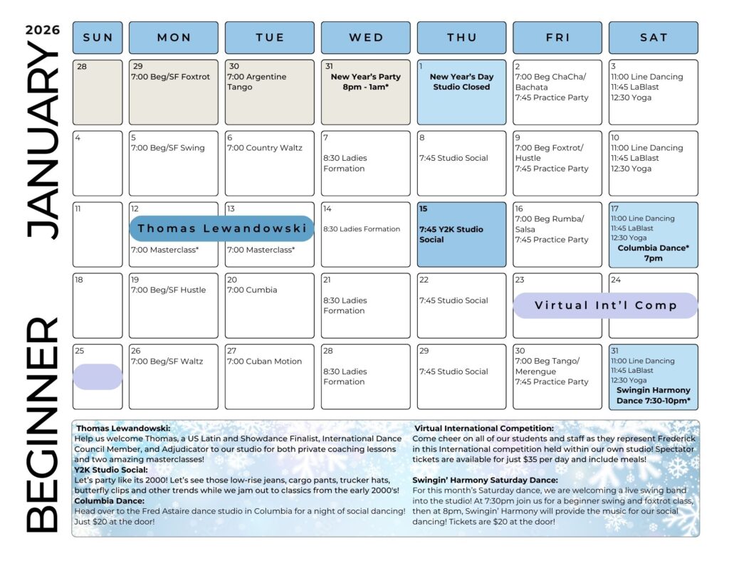 PLEASE NOTE: Our calendar of events is subject to change. Be sure to contact our studio for questions and more information.
