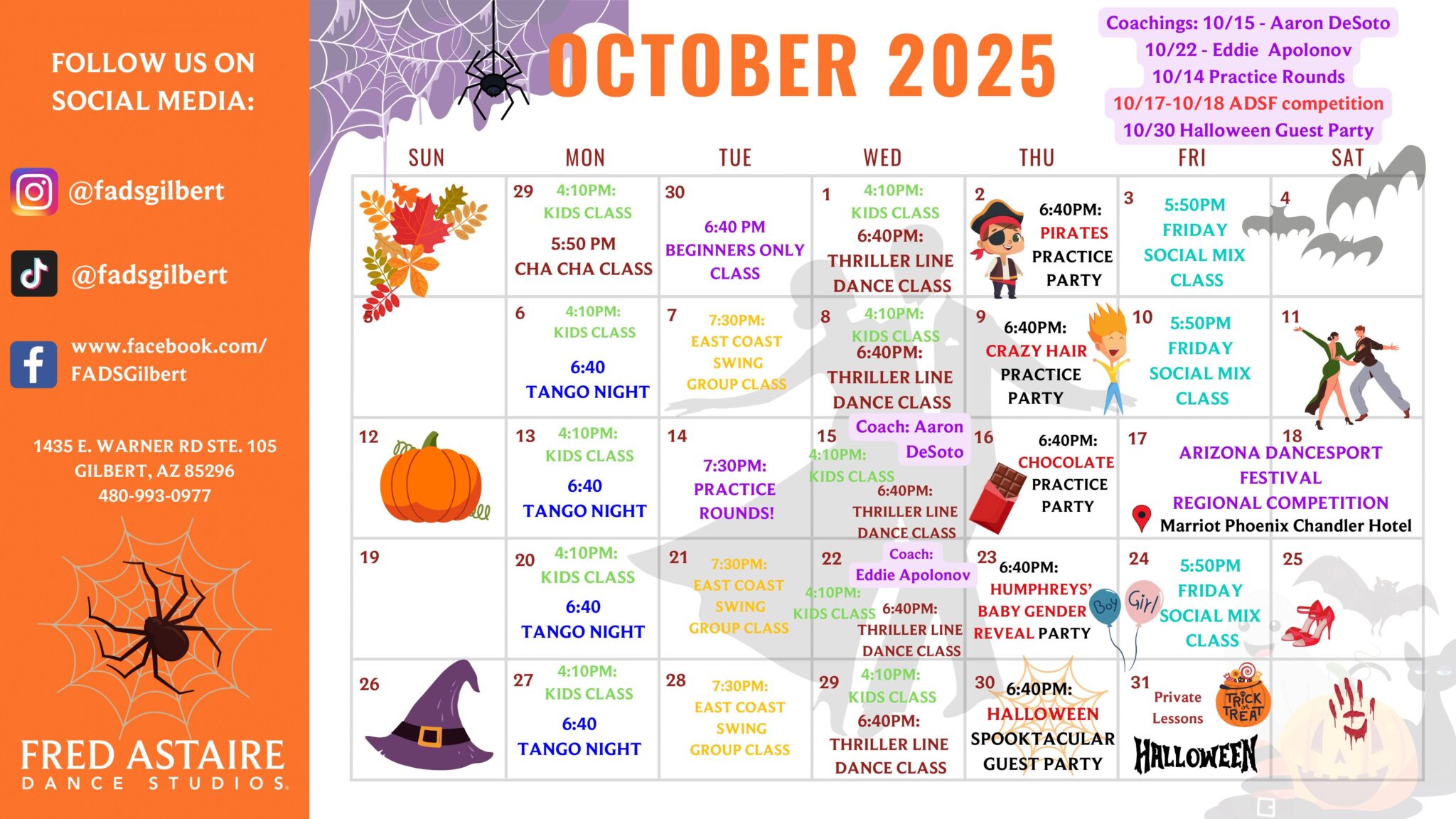 Check out this month’s schedule of Group Classes, Practice Parties and Special Events at our Studio. Come with a dance partner or by yourself. For more information and to join us, just give us a call!