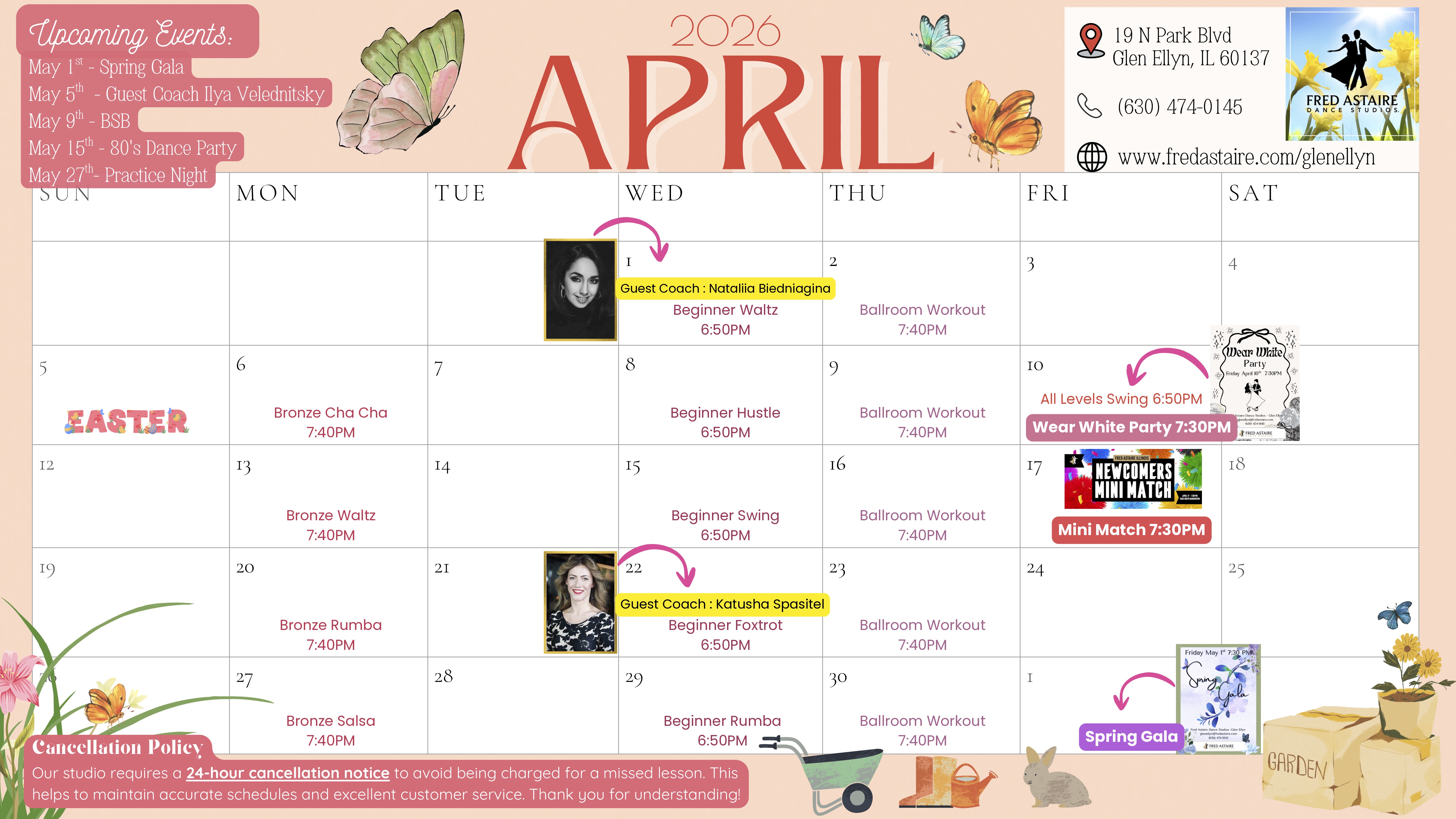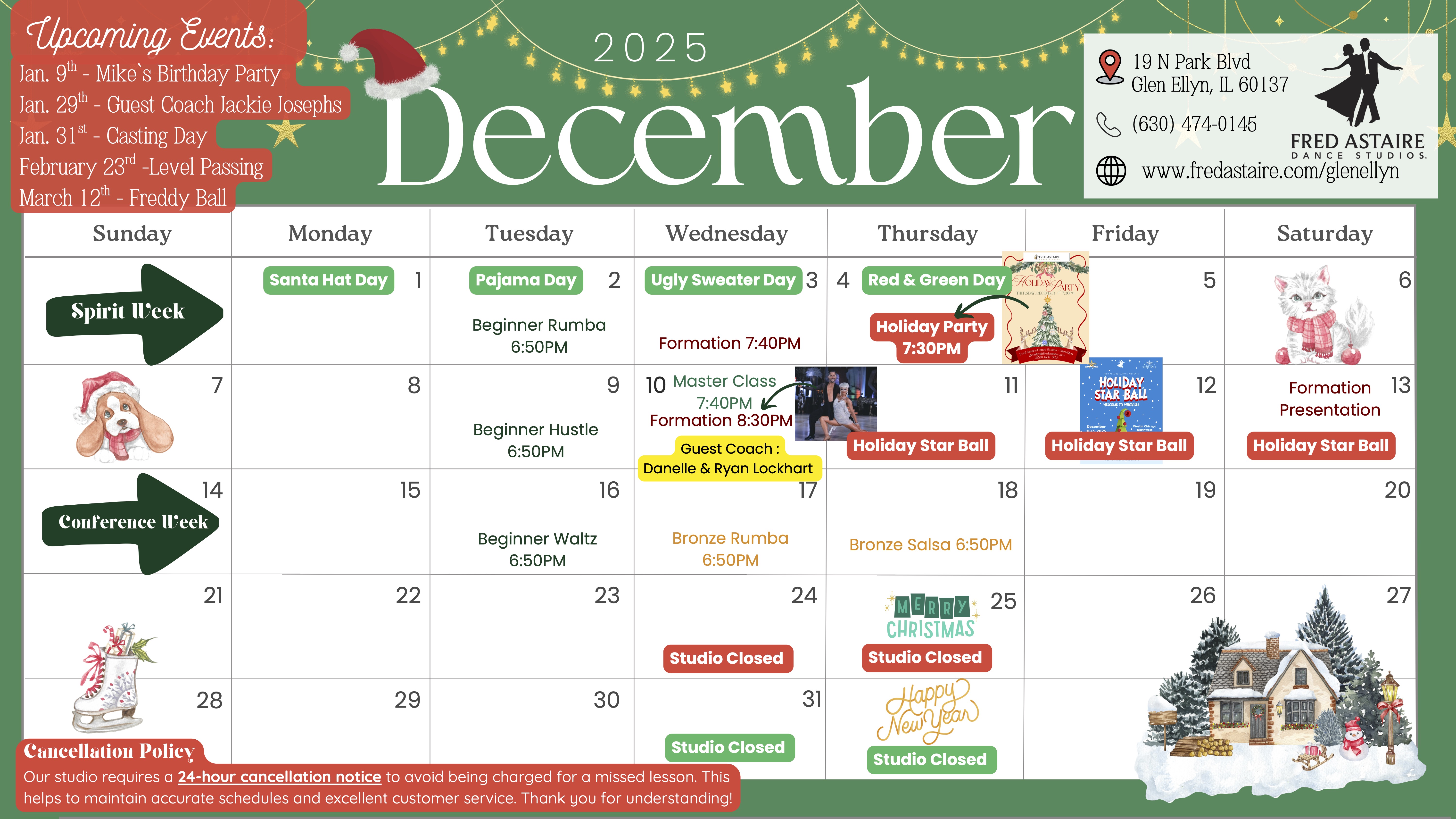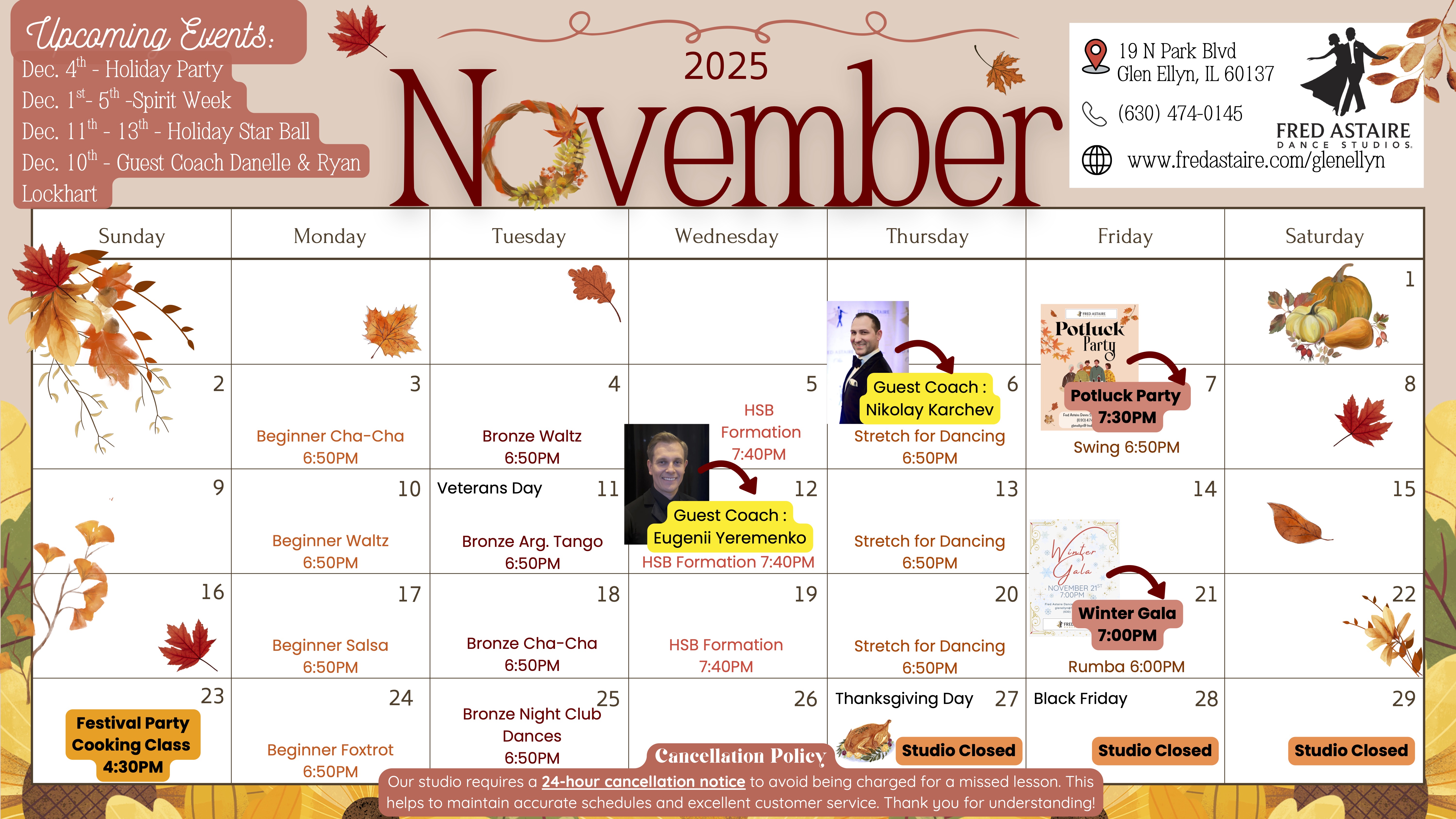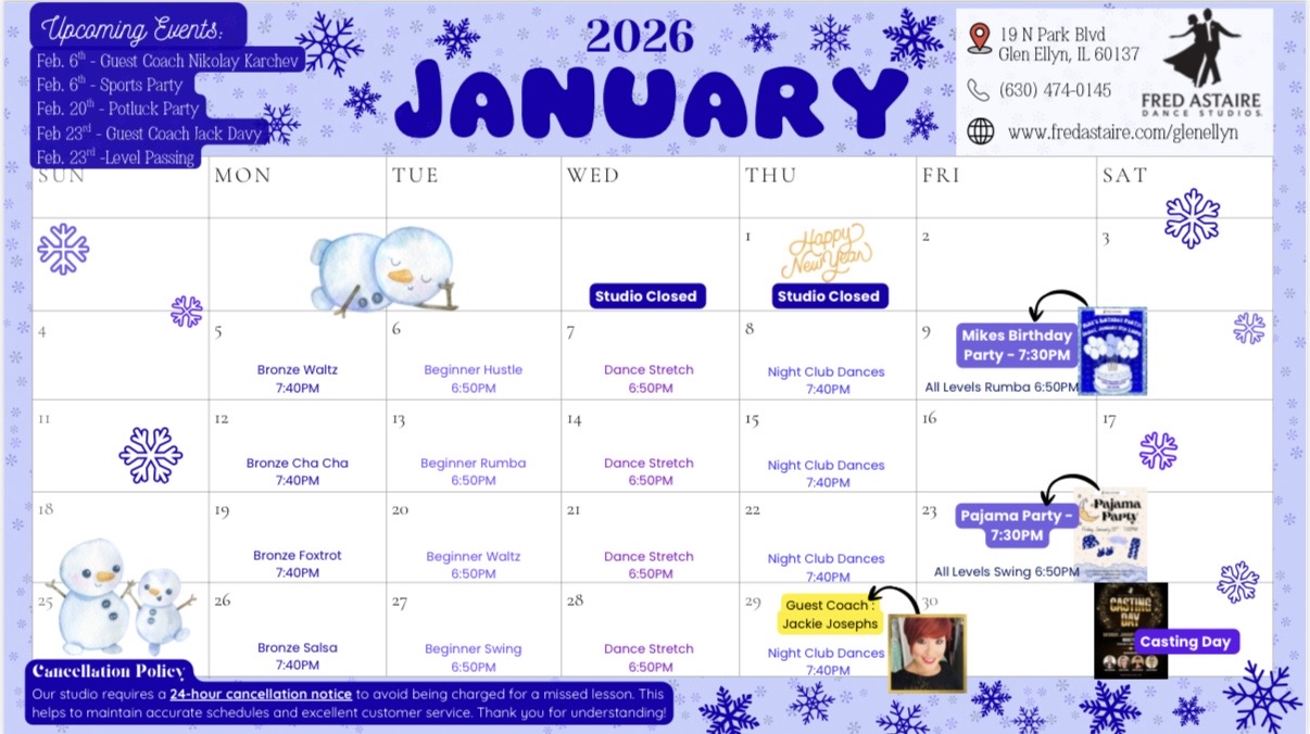 PLEASE NOTE: Our calendar of events is subject to change. Be sure to contact our studio for questions and more information.