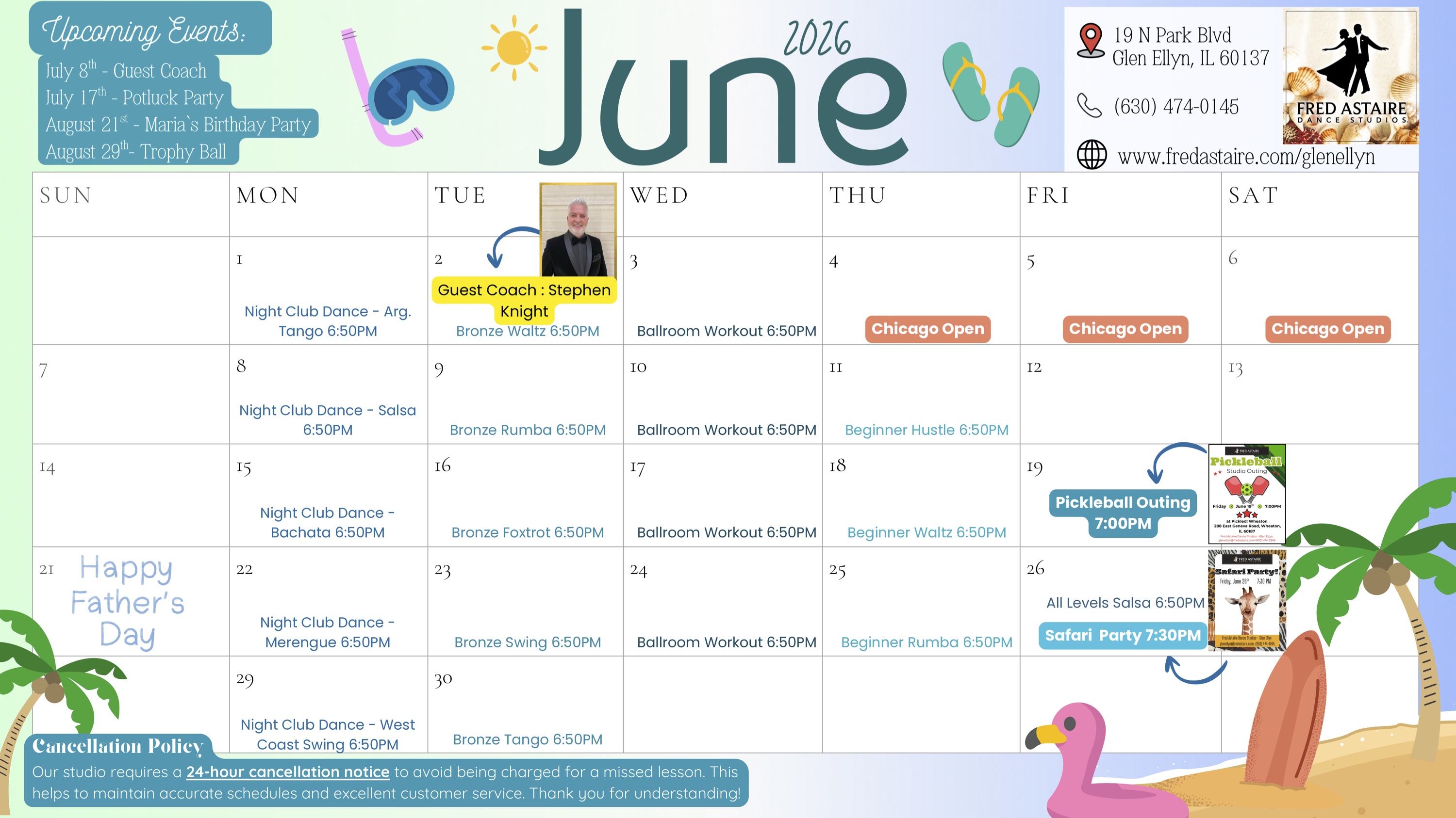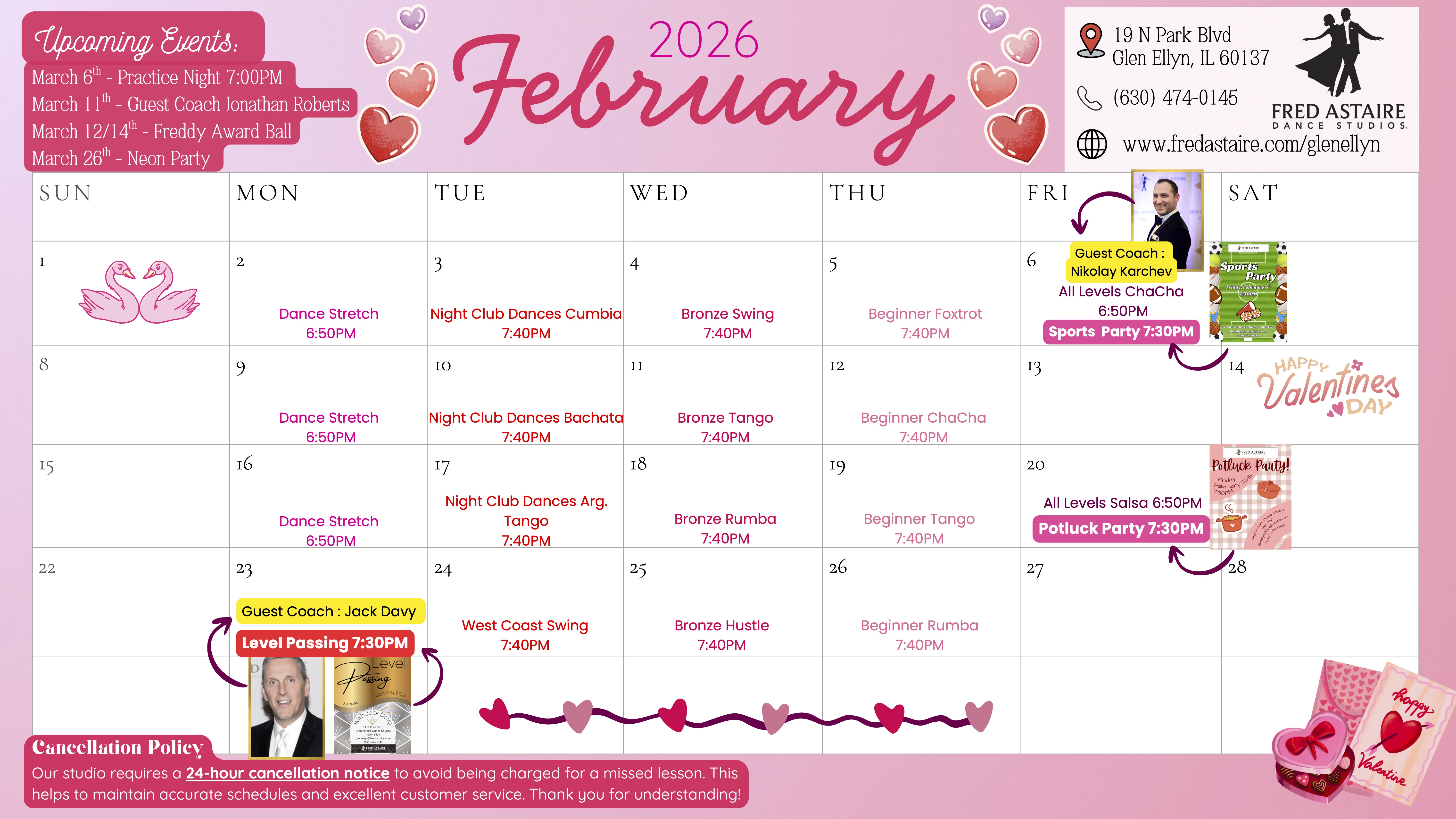 Check out this month’s schedule of Group Classes, Practice Parties and Special Events at our Studio. Come with a dance partner or by yourself. For more information and to join us, just give us a call! 630-474-0219