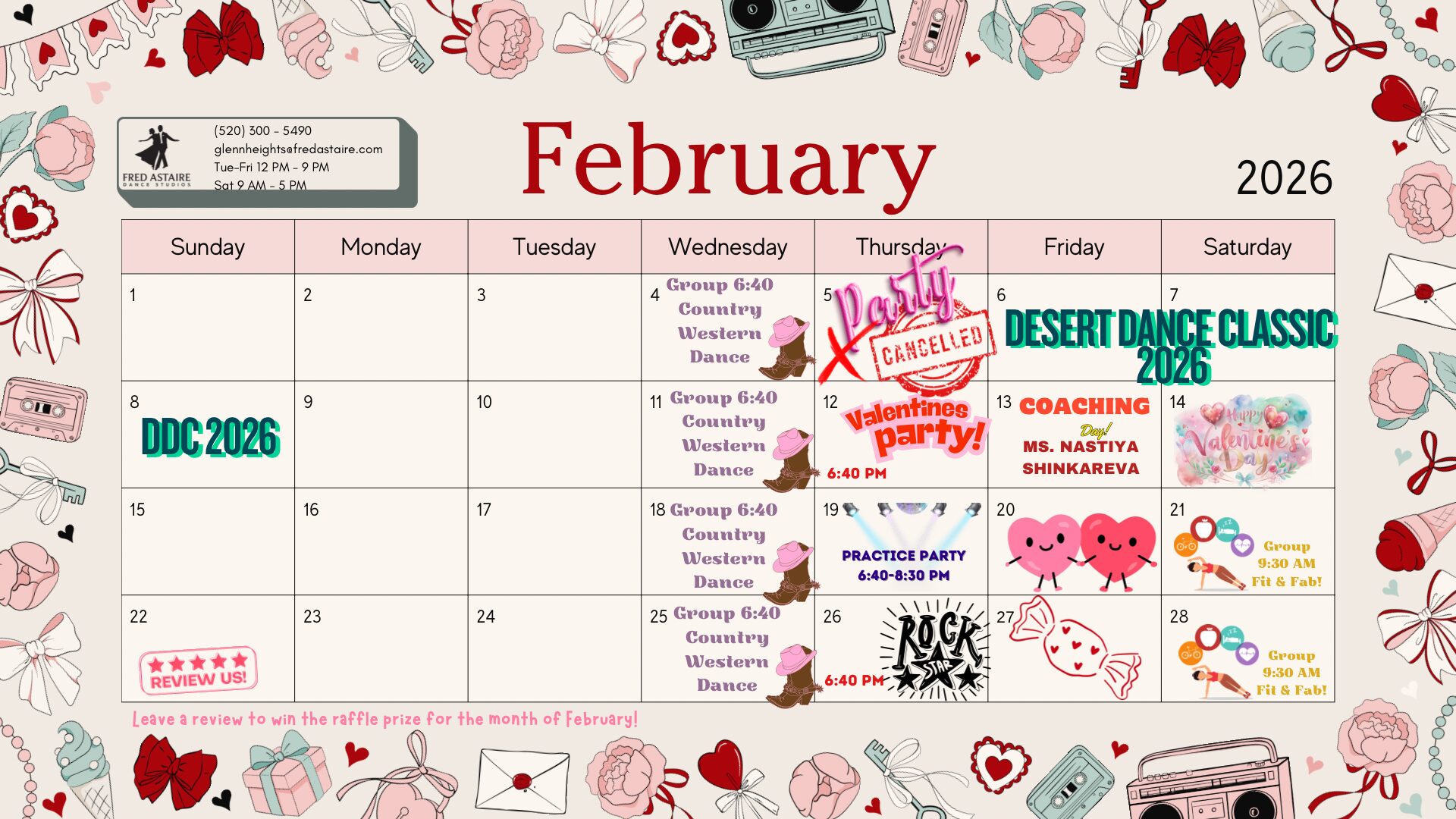 Our Glenn Heights dance studio offers private and group dance lessons, classes, studio practice parties, and much more! Check out this month’s calendar below and make sure to pick up a copy in the studio!