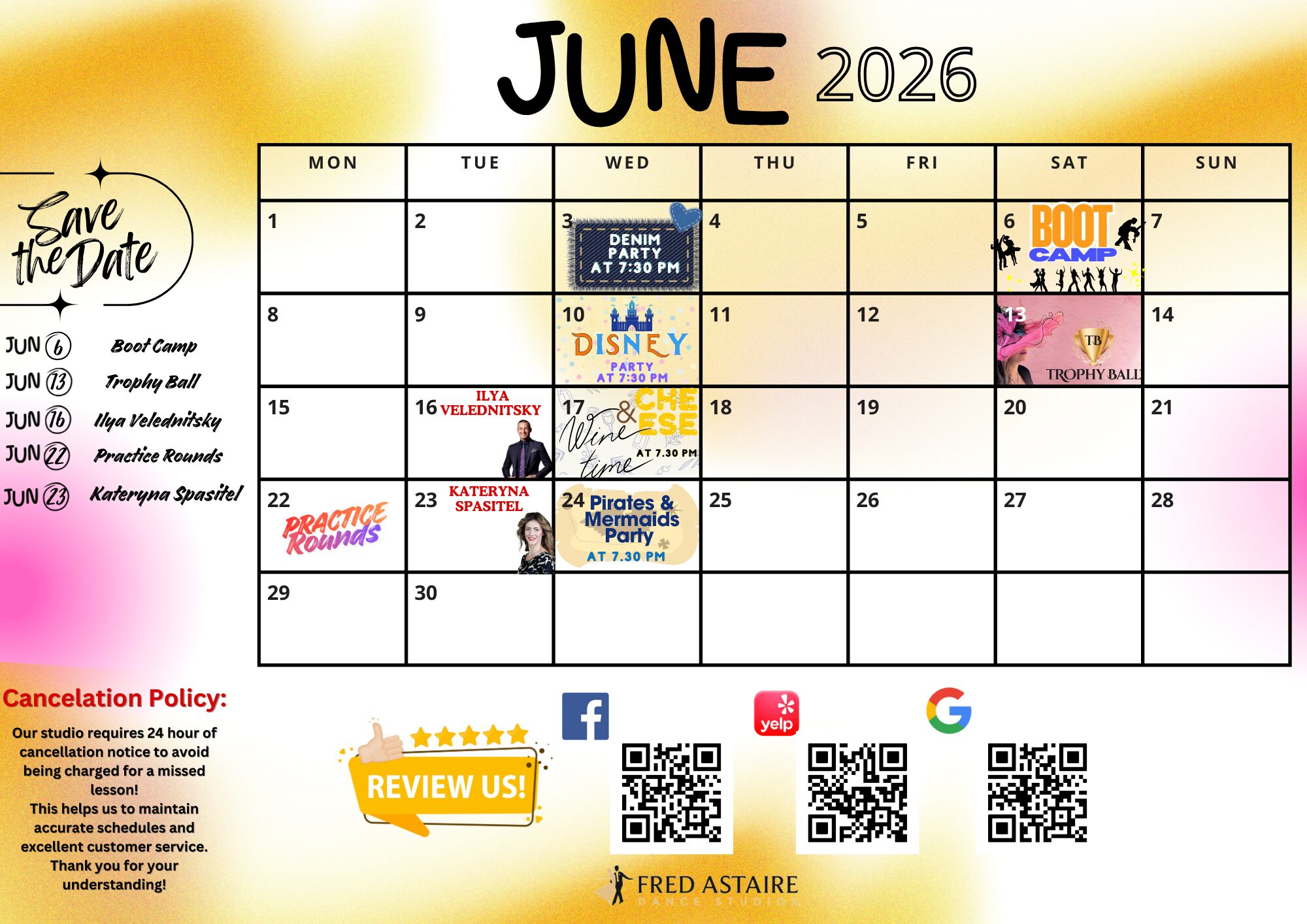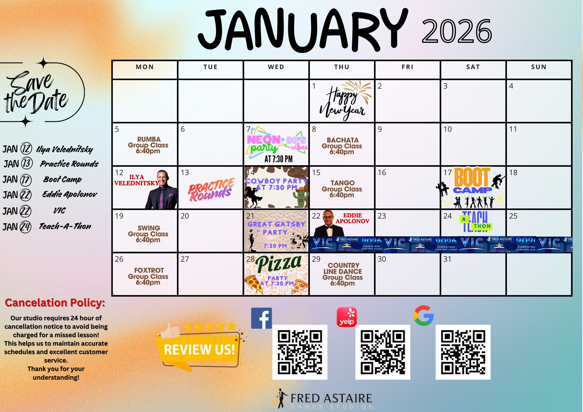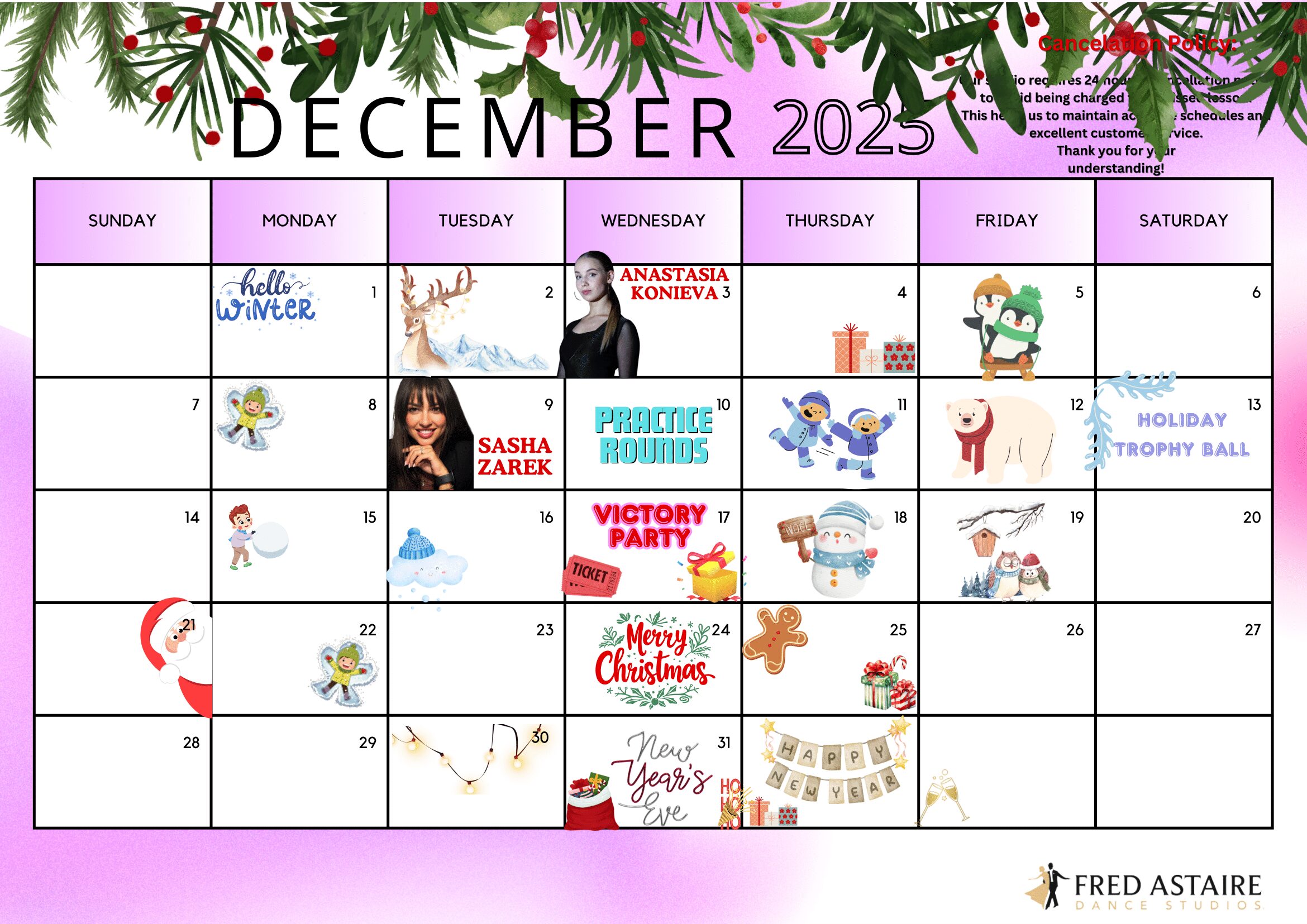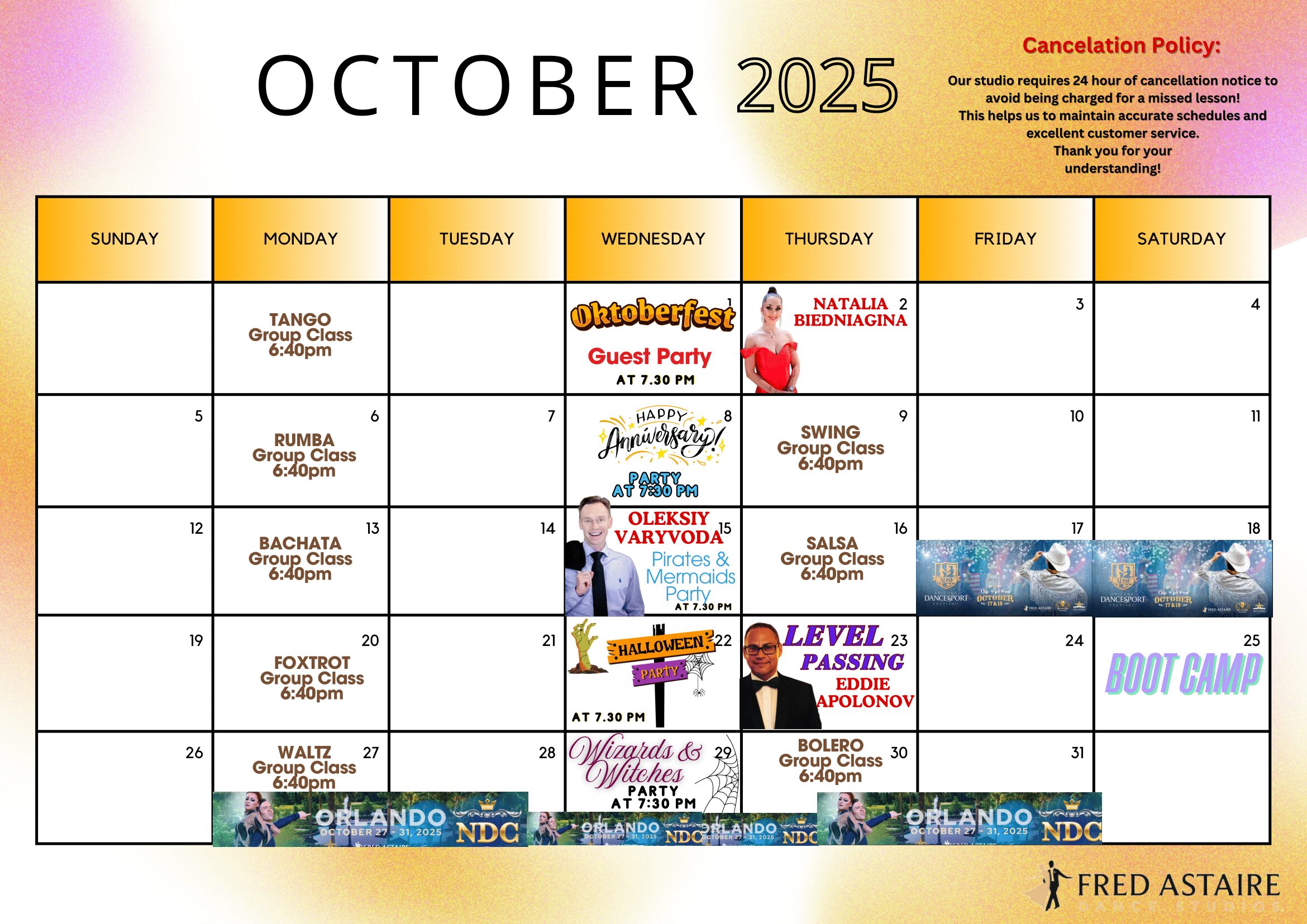 * Please Note: All of our social dance parties and events are open to the public and all dance levels are welcome! Be sure to pop in to see what we are all about! Beverages and hors d’ oeuvres are served at all parties and events*
