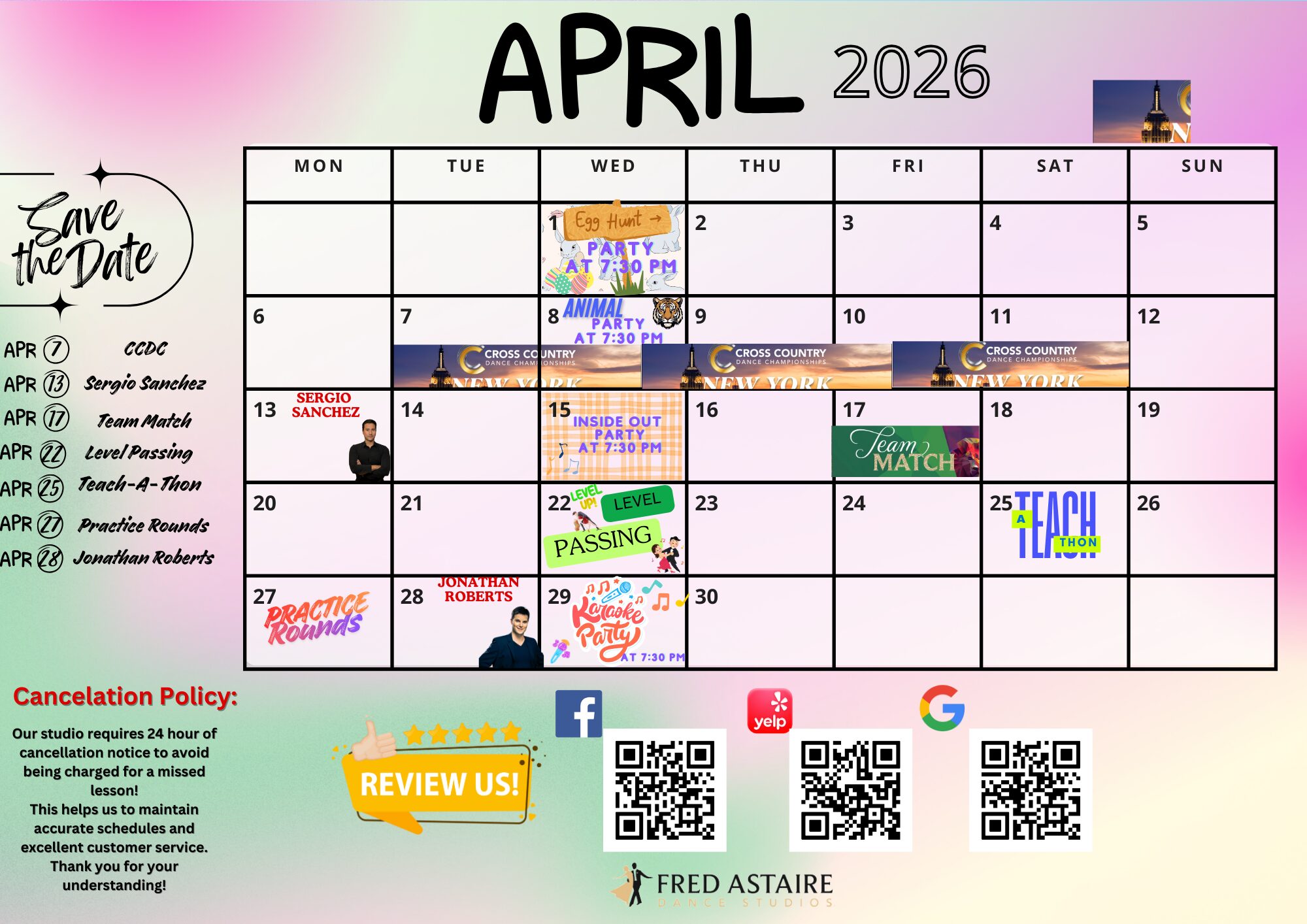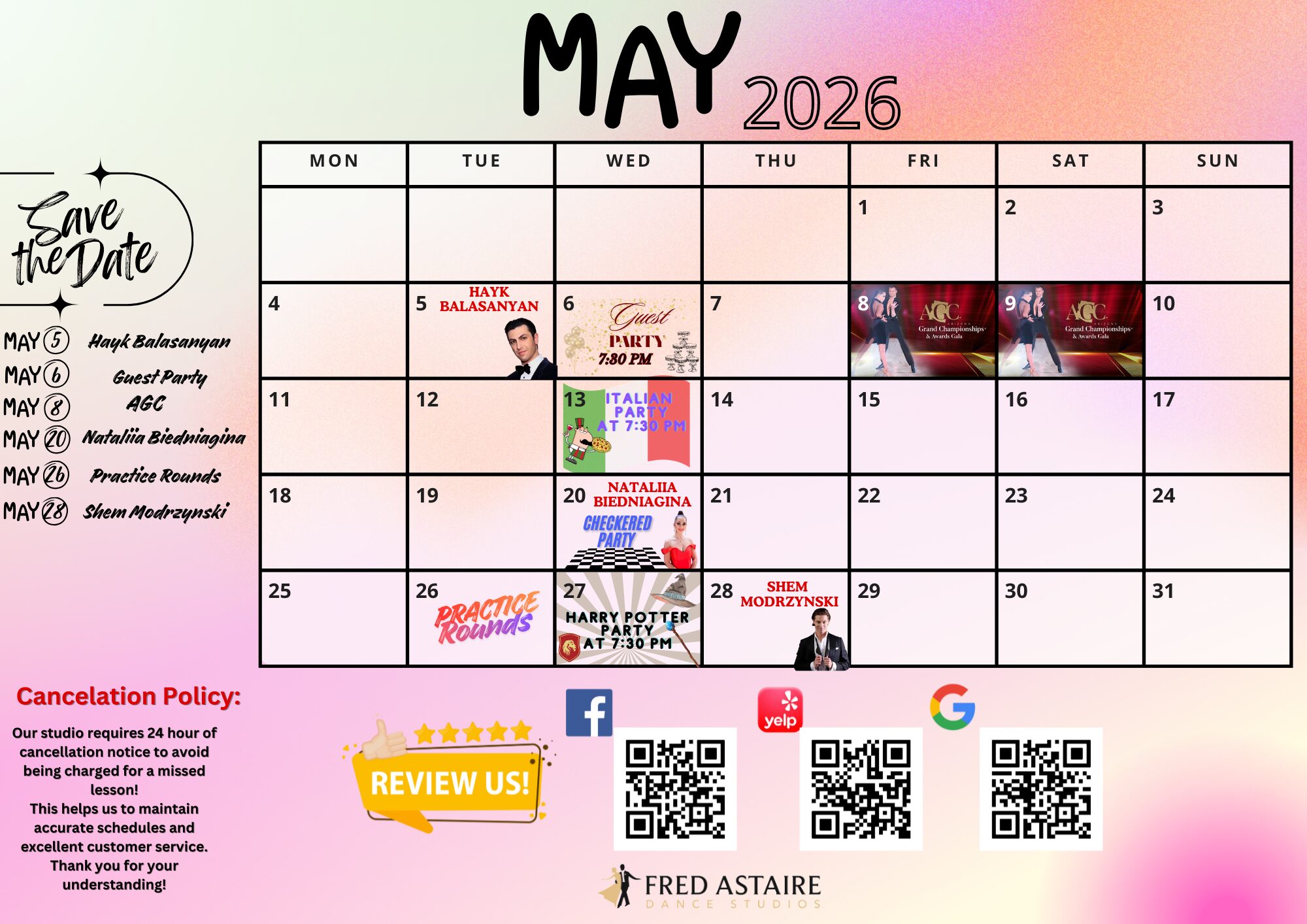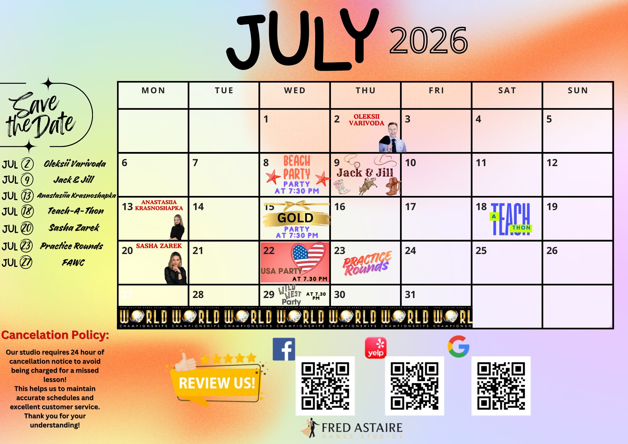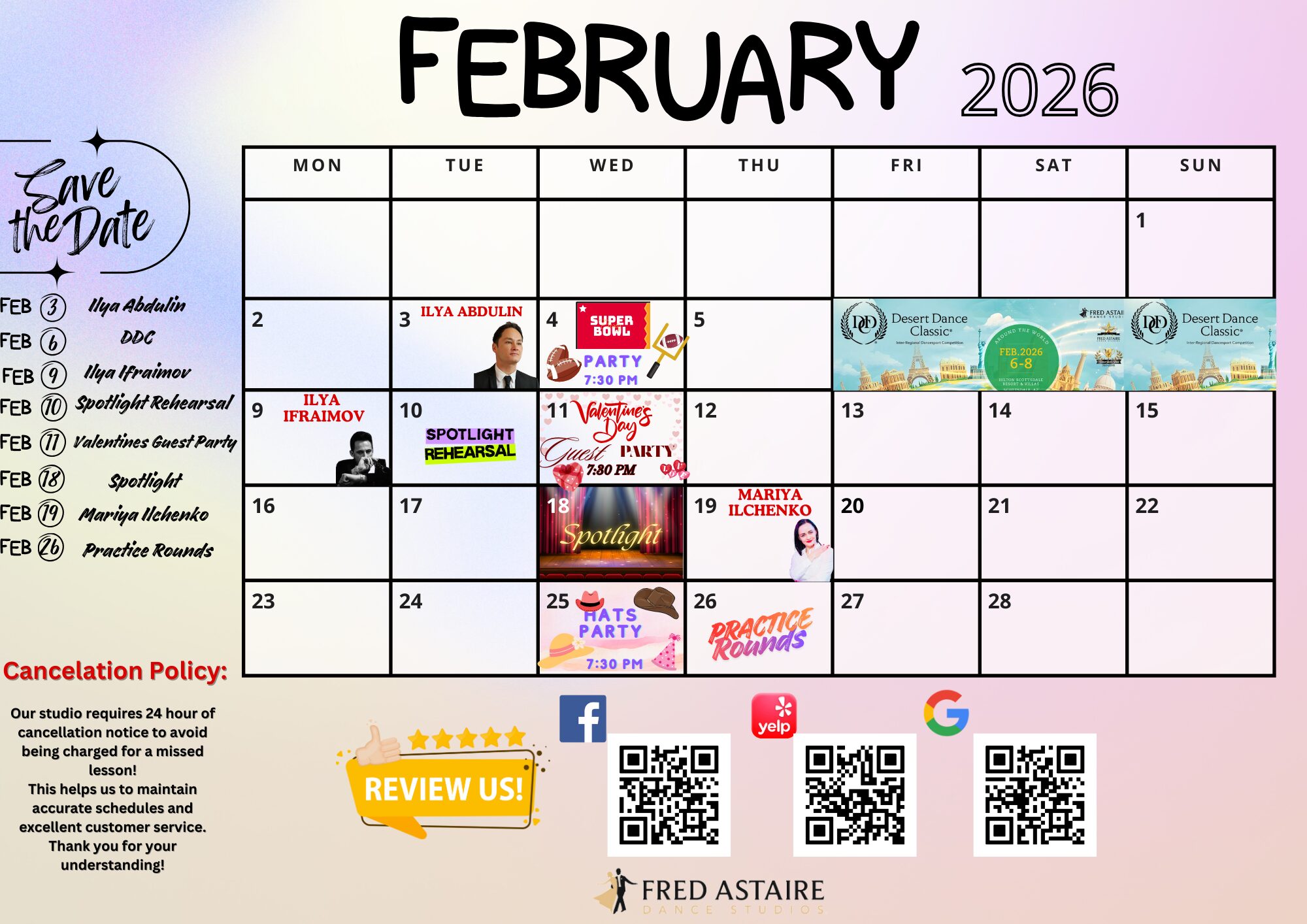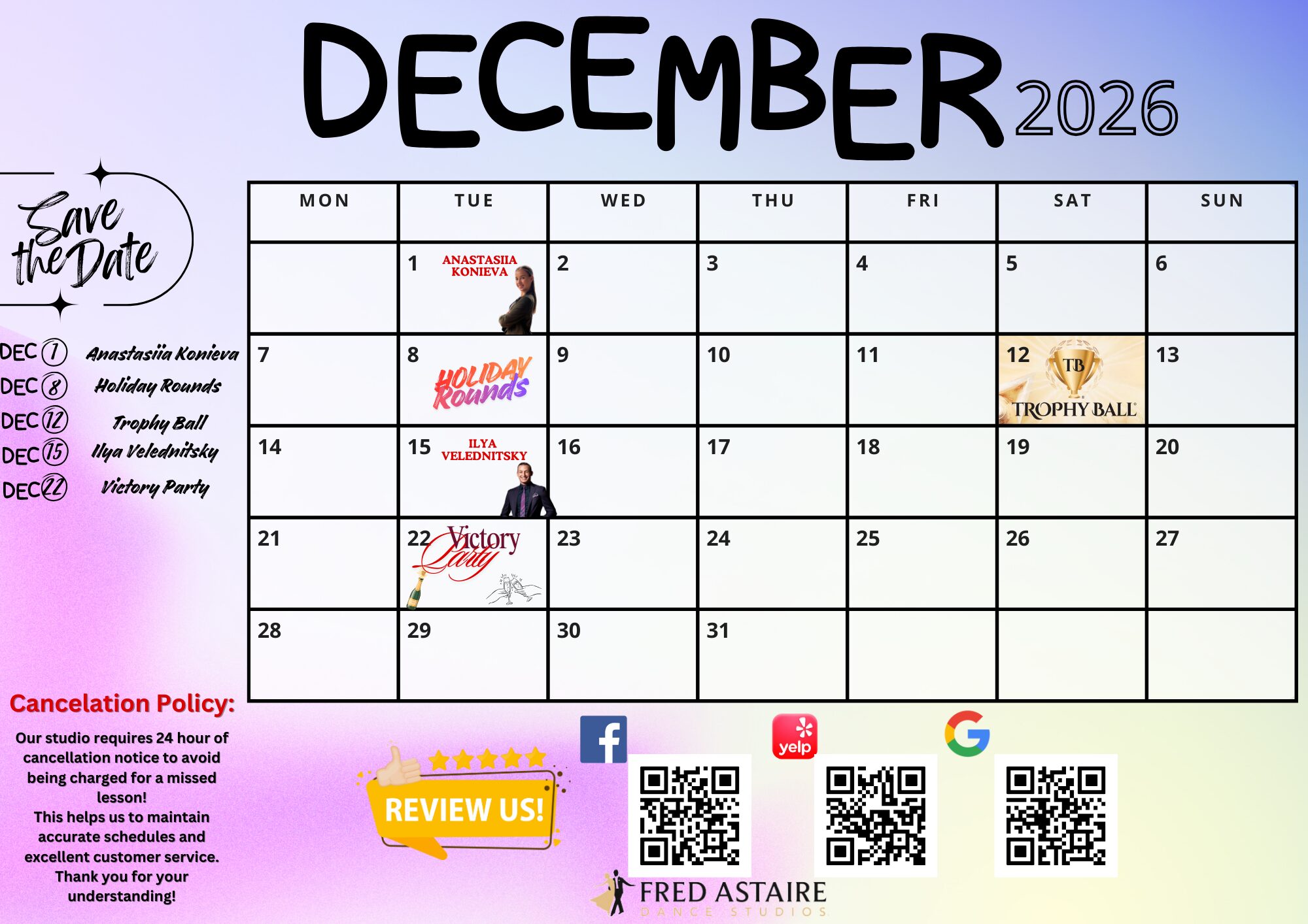 * Please Note: All of our social dance parties and events are open to the public and all dance levels are welcome! Be sure to pop in to see what we are all about! Beverages and hors d’ oeuvres are served at all parties and events*