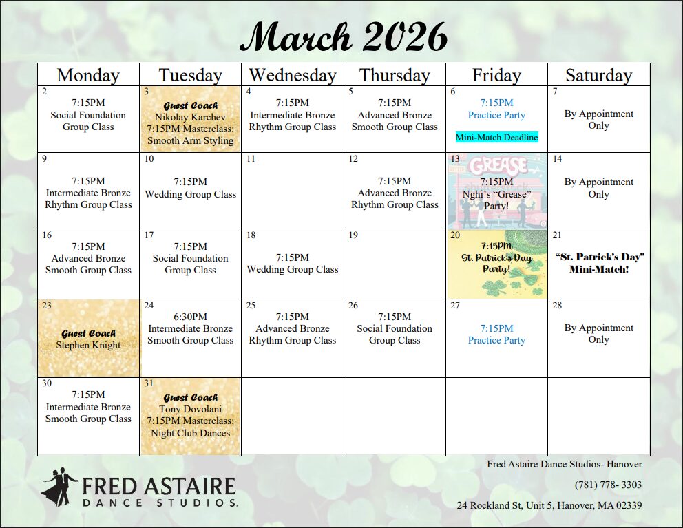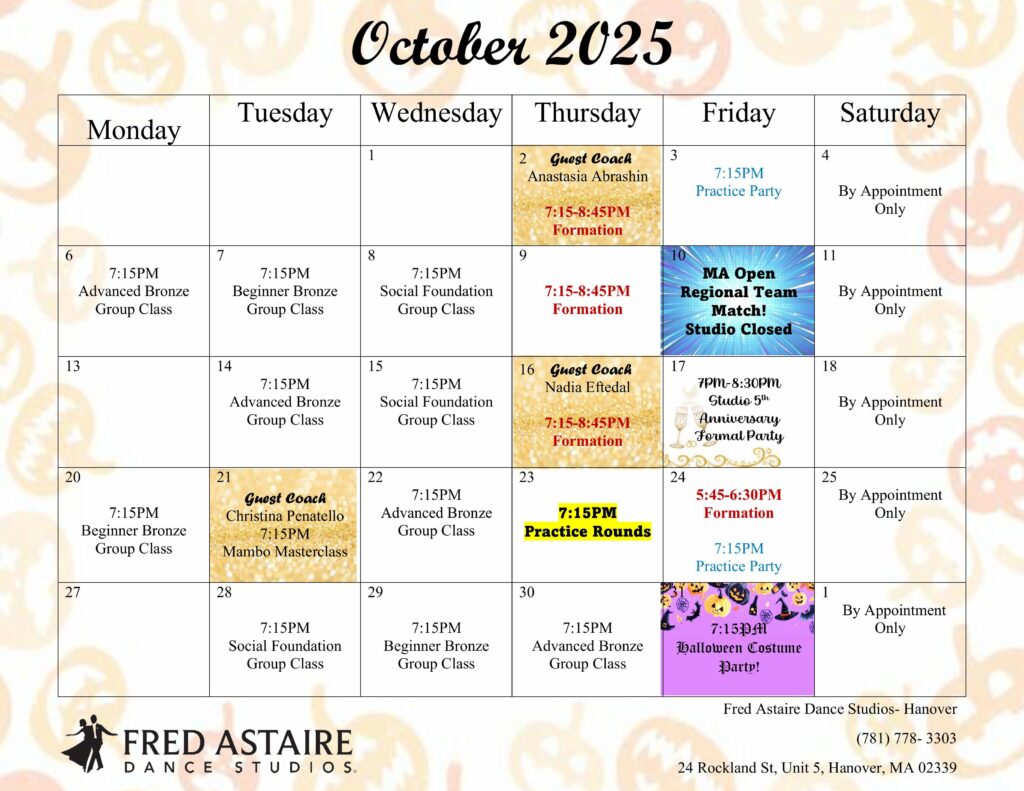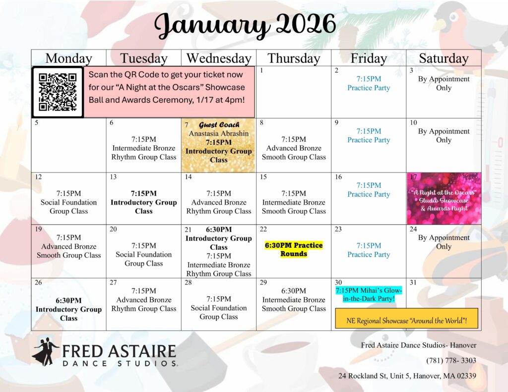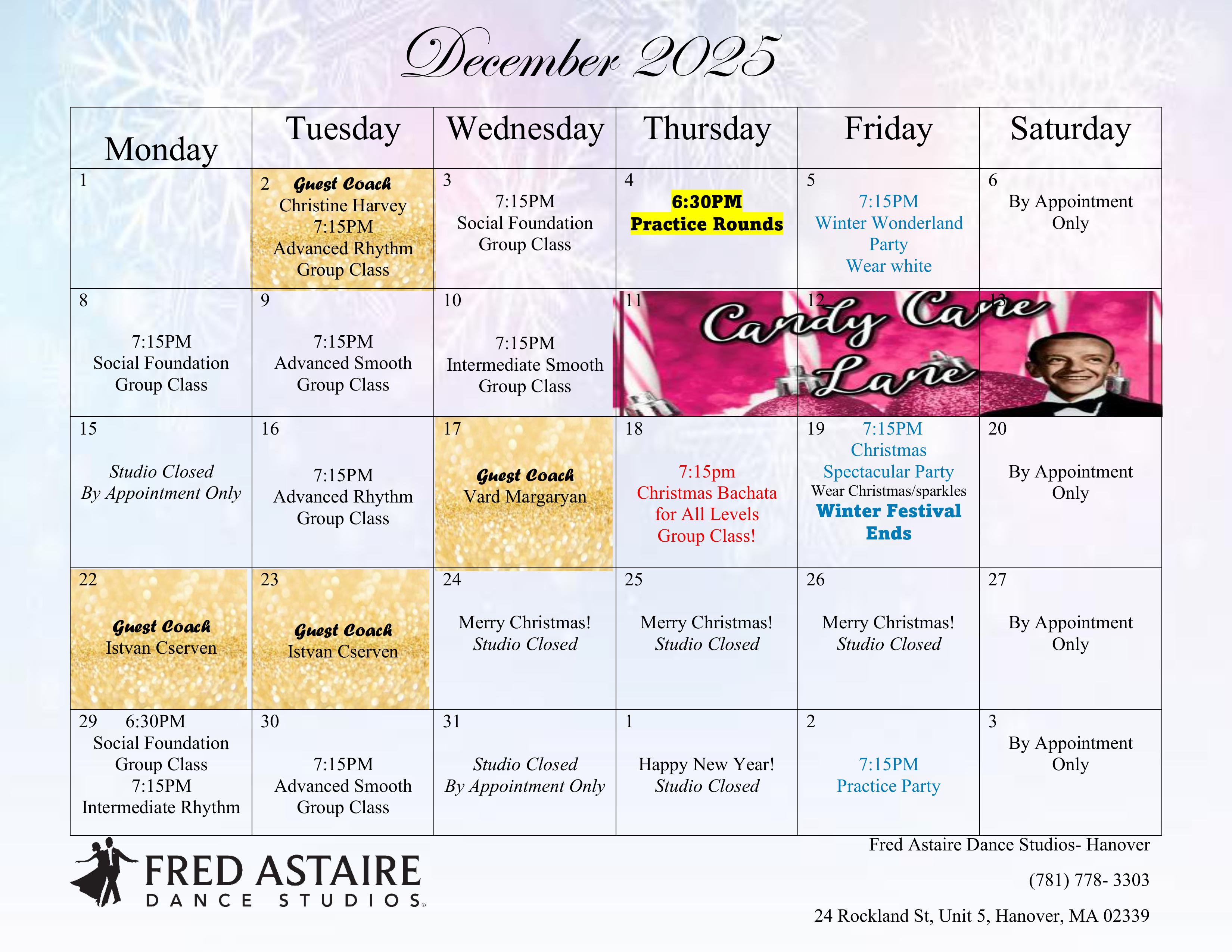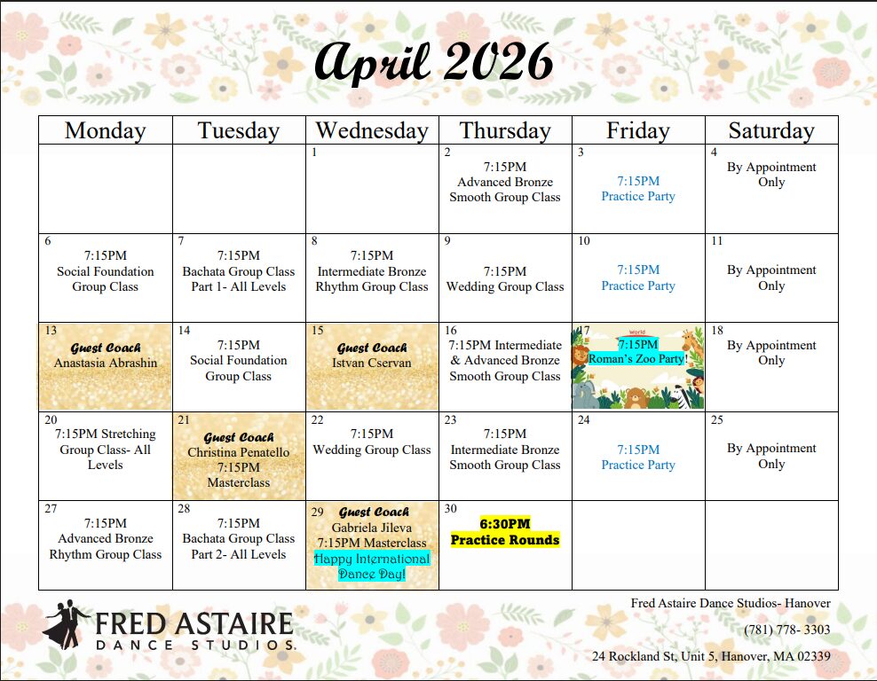 Check out our schedule of Group Classes, Practice Parties and Special Events at our Studio. Come with a dance partner or by yourself. For more information and to join us, just give us a call!
