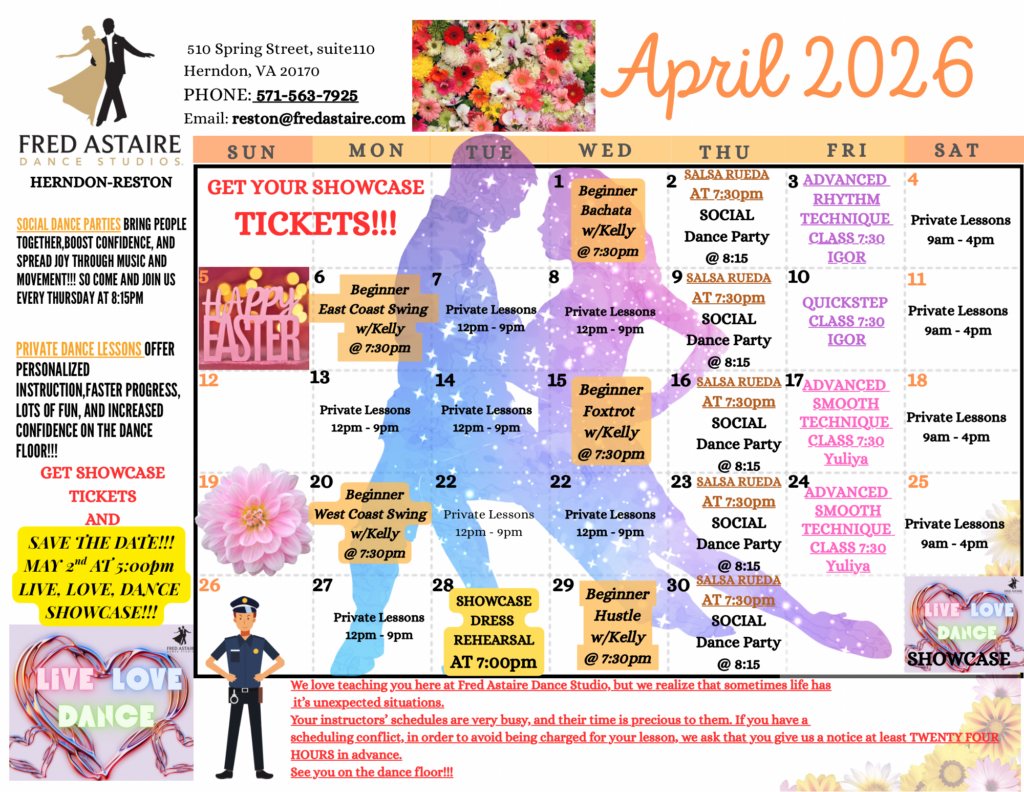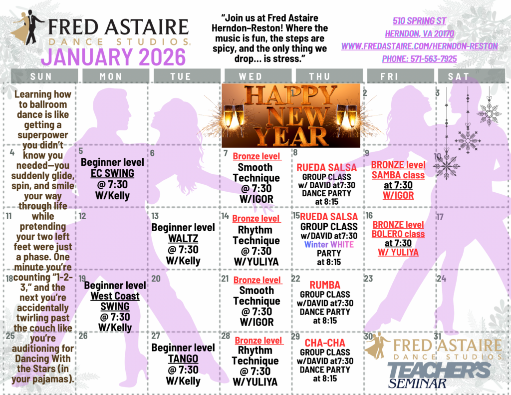 Fred Astaire Reston Group Class Calendar. Group classes are an important part of your dance journey, group classes build muscle memory and build friendships. Please consult our monthly calendar below for group class skill levels and availability, so you can find the perfect class for you!