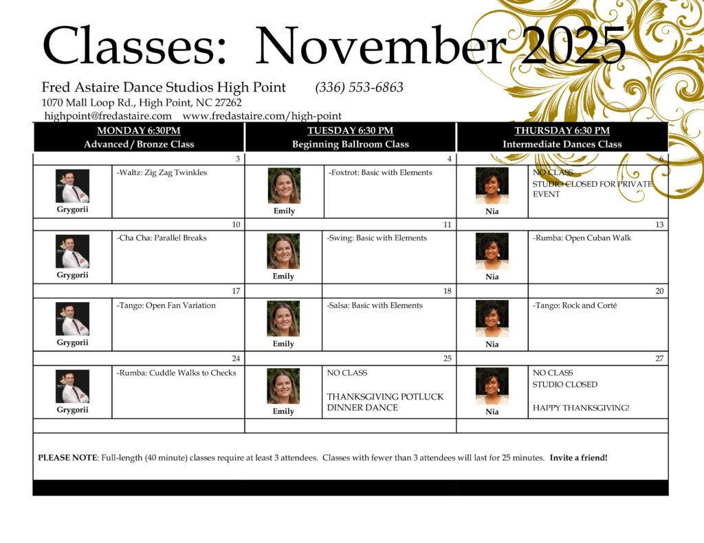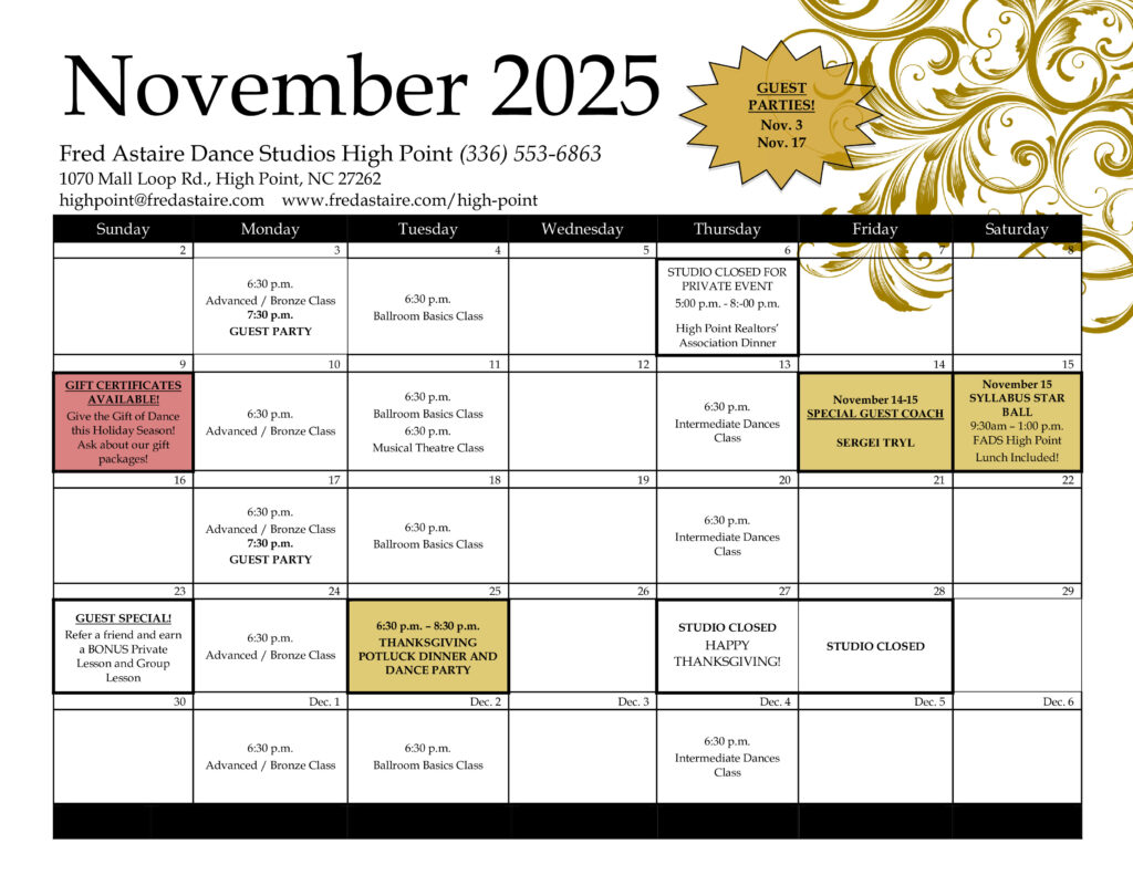 Below you will find our monthly calendar of events for Fred Astaire Dance Studio of High Point, including group classes, practice parties, and special events!