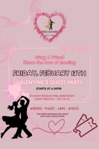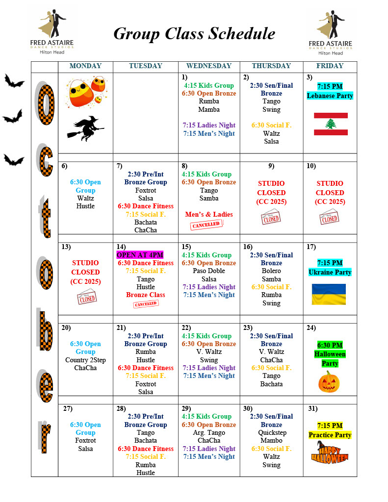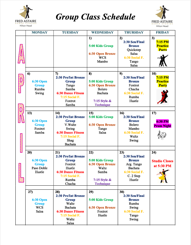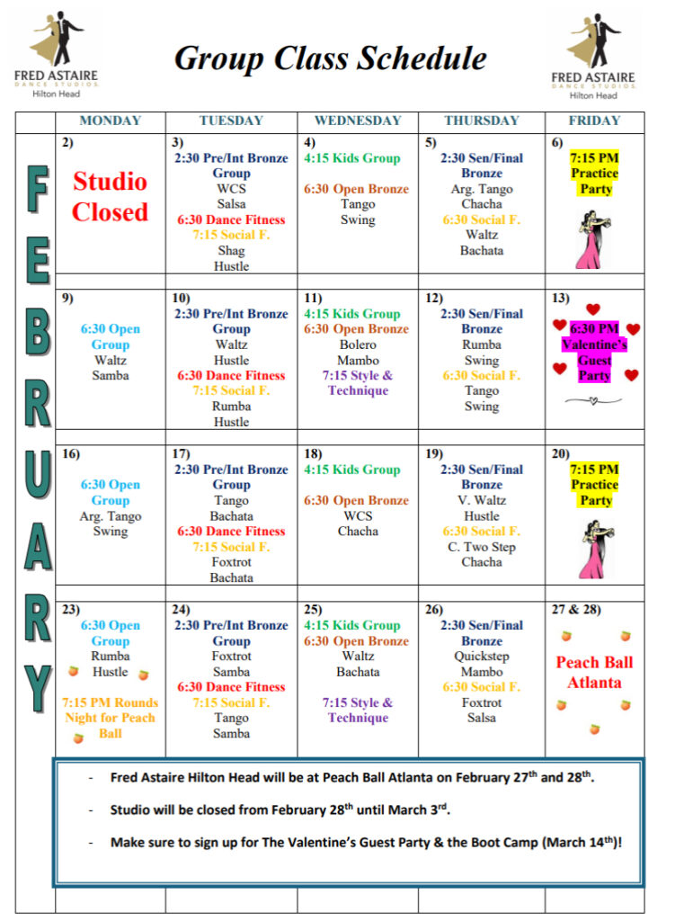 Check out this month’s schedule of Group Classes, Practice Parties and Special Events at our Studio. Come with a dance partner or by yourself. For more information and to join us, just give us a call!
