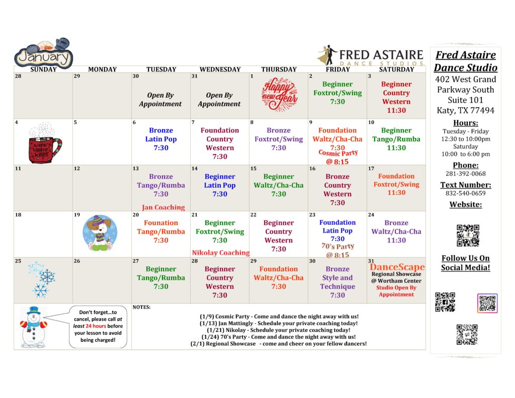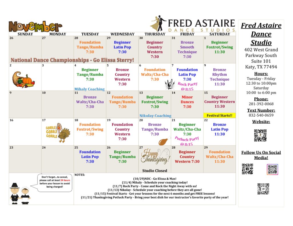 Check out this month’s schedule of Group Classes, Practice Parties and Special Events at our Studio. Come with a dance partner or by yourself. For more information and to join us, just give us a call!