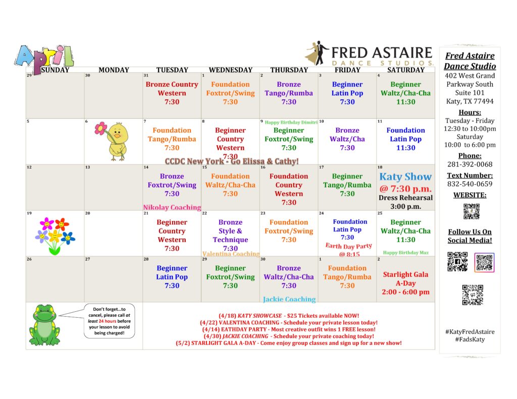 Check out this month’s schedule of Group Classes, Practice Parties and Special Events at our Studio. Come with a dance partner or by yourself. For more information and to join us, just give us a call!