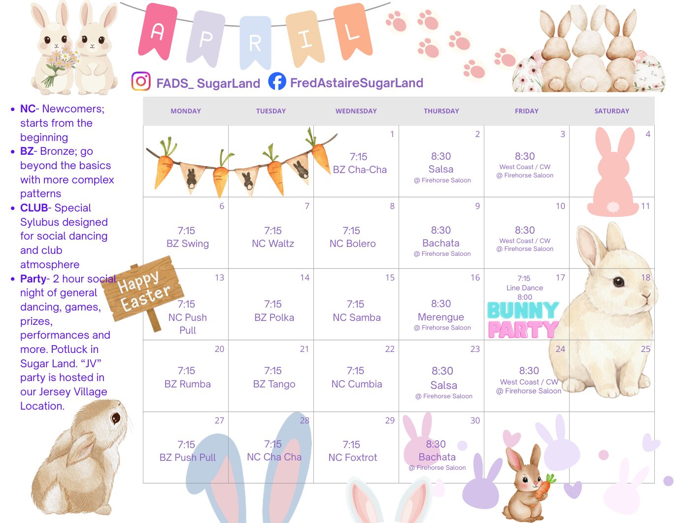 Check out this month’s schedule of Group Classes, Practice Parties and Special Events at our Studio. Come with a dance partner or by yourself. For more information and to join us, just give us a call!